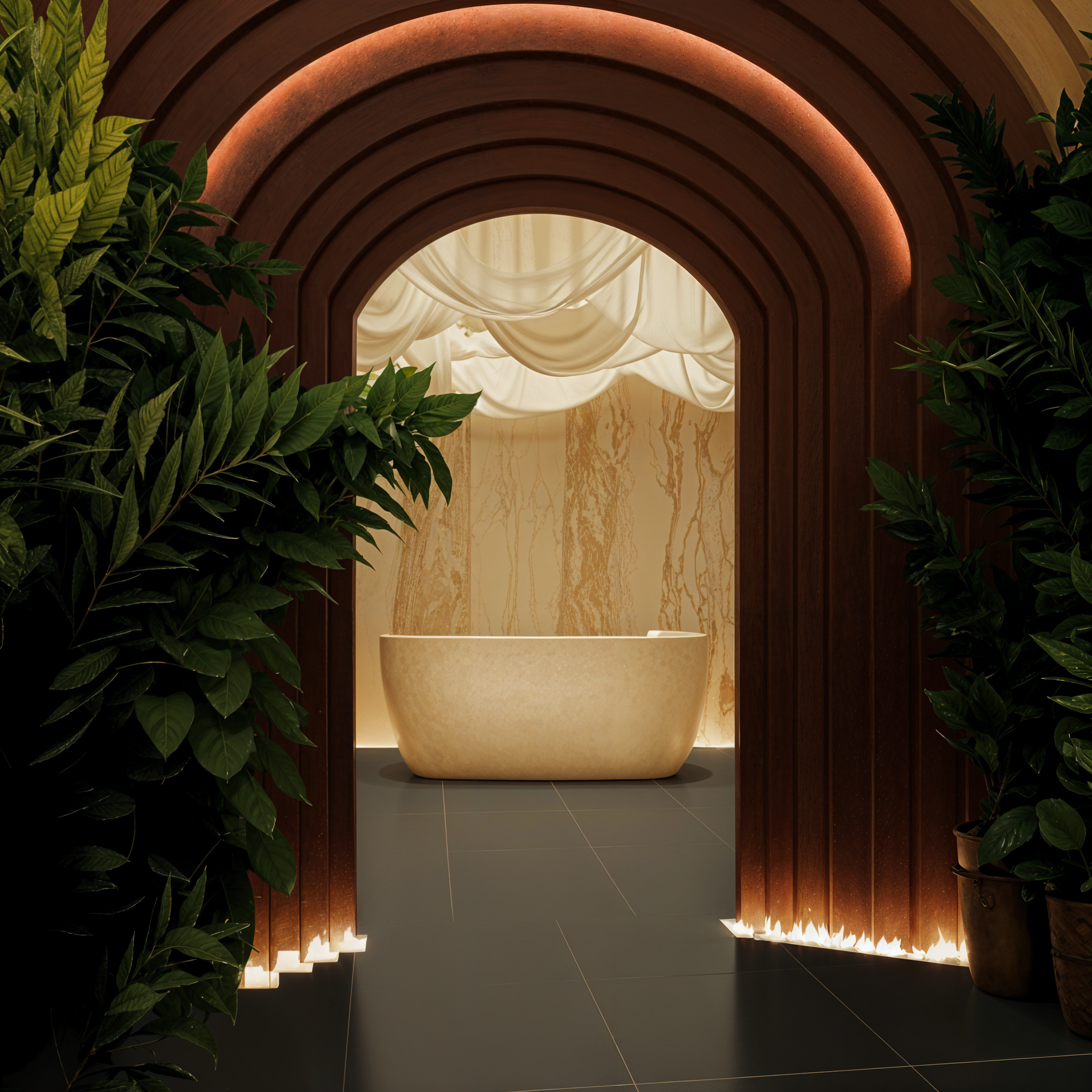 convert this architectural render into a hyperrealistic photograph while preserving the exact architecture and layout improve realism of materials lighting and textures without changing the design entrance to a wellness sanctuary featuring a monumental archway made of deep red roman clay plaster leading into a foyer inside the foyer is a sculptural check in counter extending wall to wall behind the counter is a warm beige travertine backdrop with subtle red undertones the ceiling above the foyer features flowing suspended linen fabrics that softly diffuse light and create organic movement enhance material realism detailed clay plaster texture porous natural travertine stone grain matte microcement surfaces soft woven linen fabric lighting should feel natural and cinematic warm indirect architectural lighting soft shadows subtle global illumination realistic bounce light on stone and clay surfaces architectural photography style 24mm lens professional interior photography ultra realistic lighting natural imperfections high dynamic range physically accurate materials depth and atmospheric realism