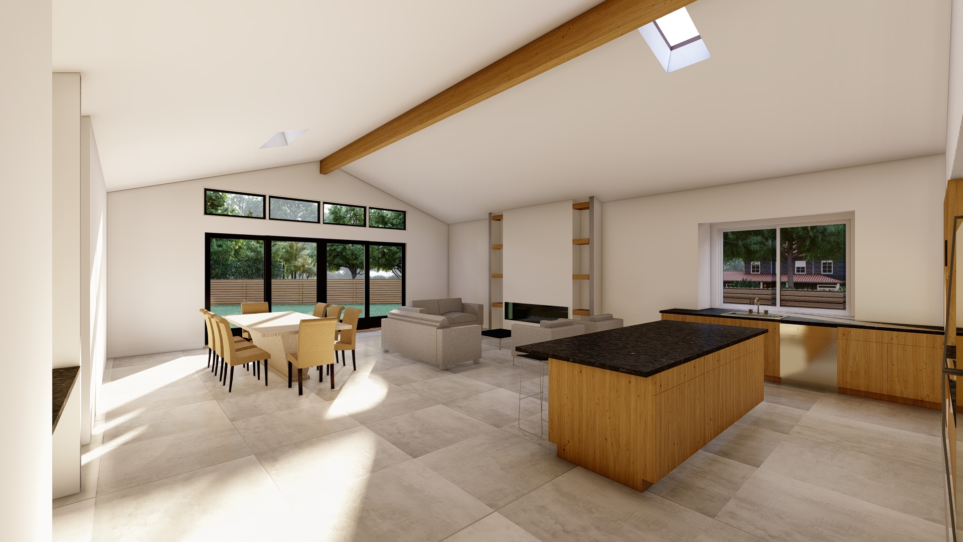 make it modern finish remove those shelves aroudn fire place and make the fire place linear and modern remove the sky light clopse to fire place