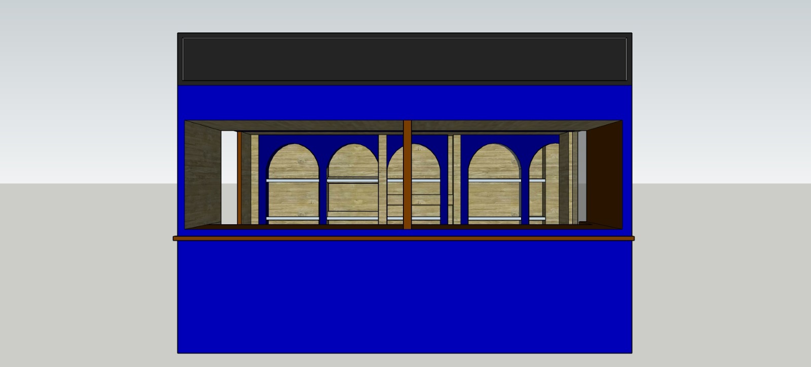 change the blue color of the facade and interior into dark brown wood put more led light as decor drinks here as writing on the black stripe above