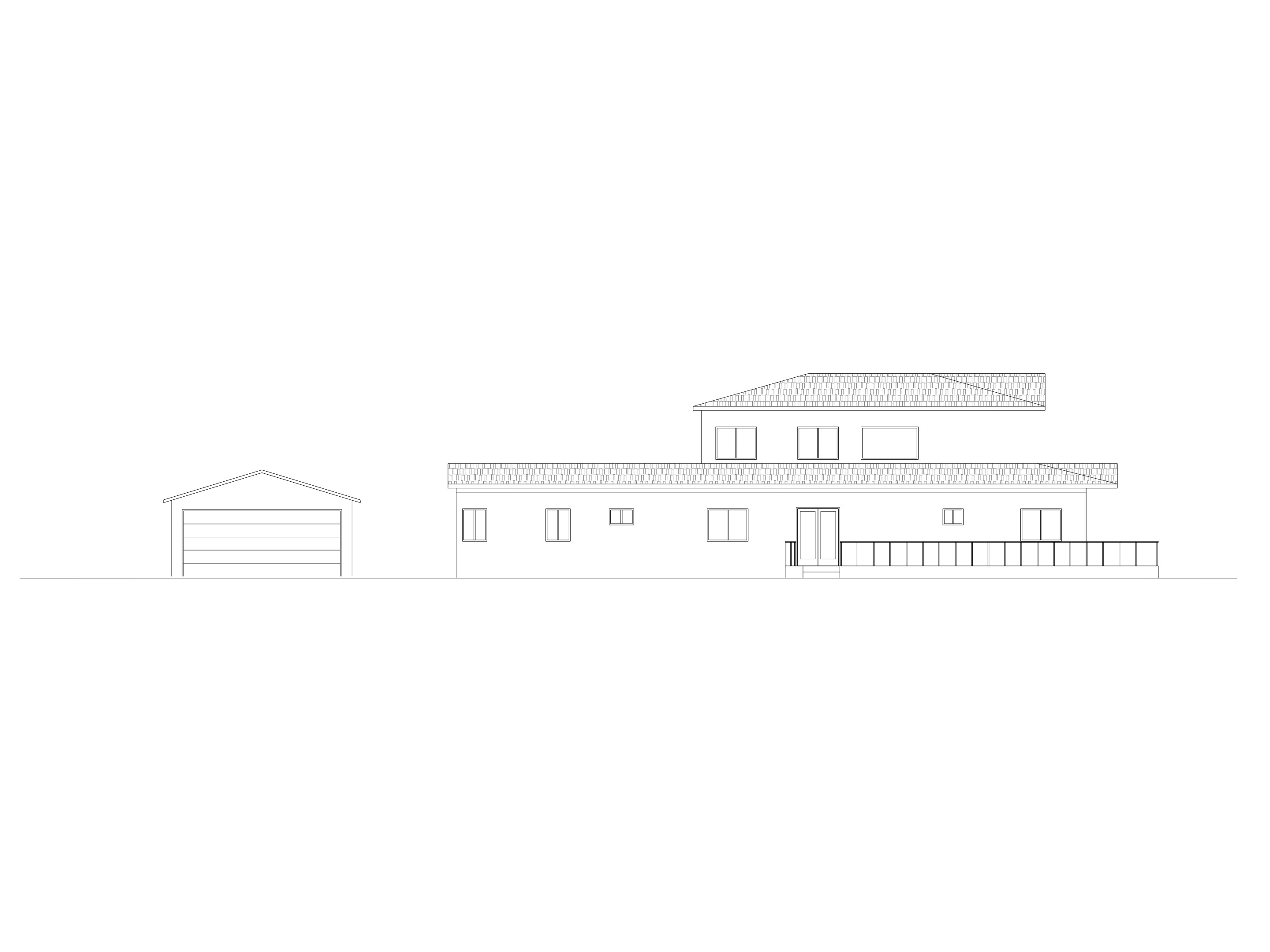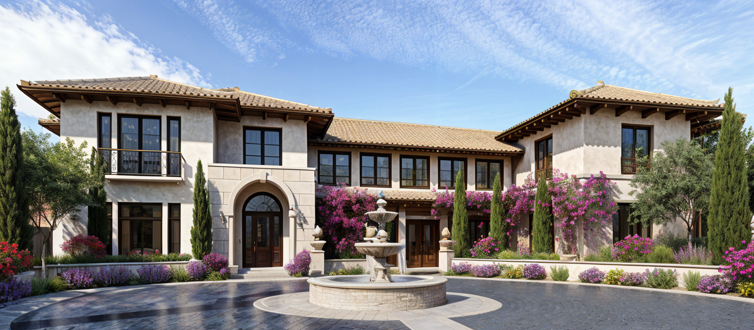 a contemporary two story house in a minimalist style with a detached garage the house features a soft beige exterior with large windows framed in dark brown the roof is sleek and lined with charcoal gray tiles the porch and railing are painted in a crisp white surround the scene with a lush green lawn and a serene garden filled with colorful flowers the sky is a clear blue with a warm golden sunlight casting gentle shadows creating a peaceful and inviting atmosphere clasic california residence