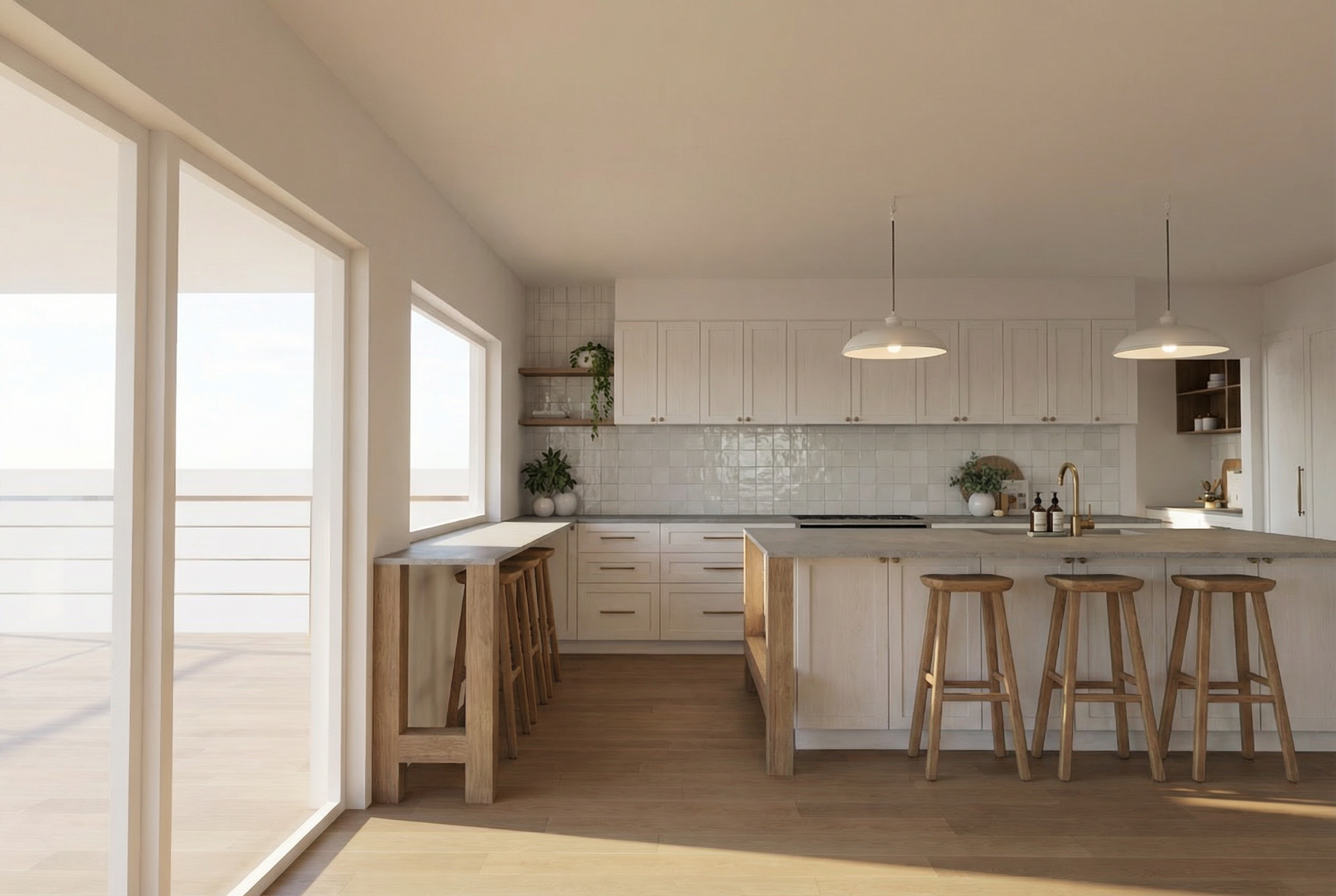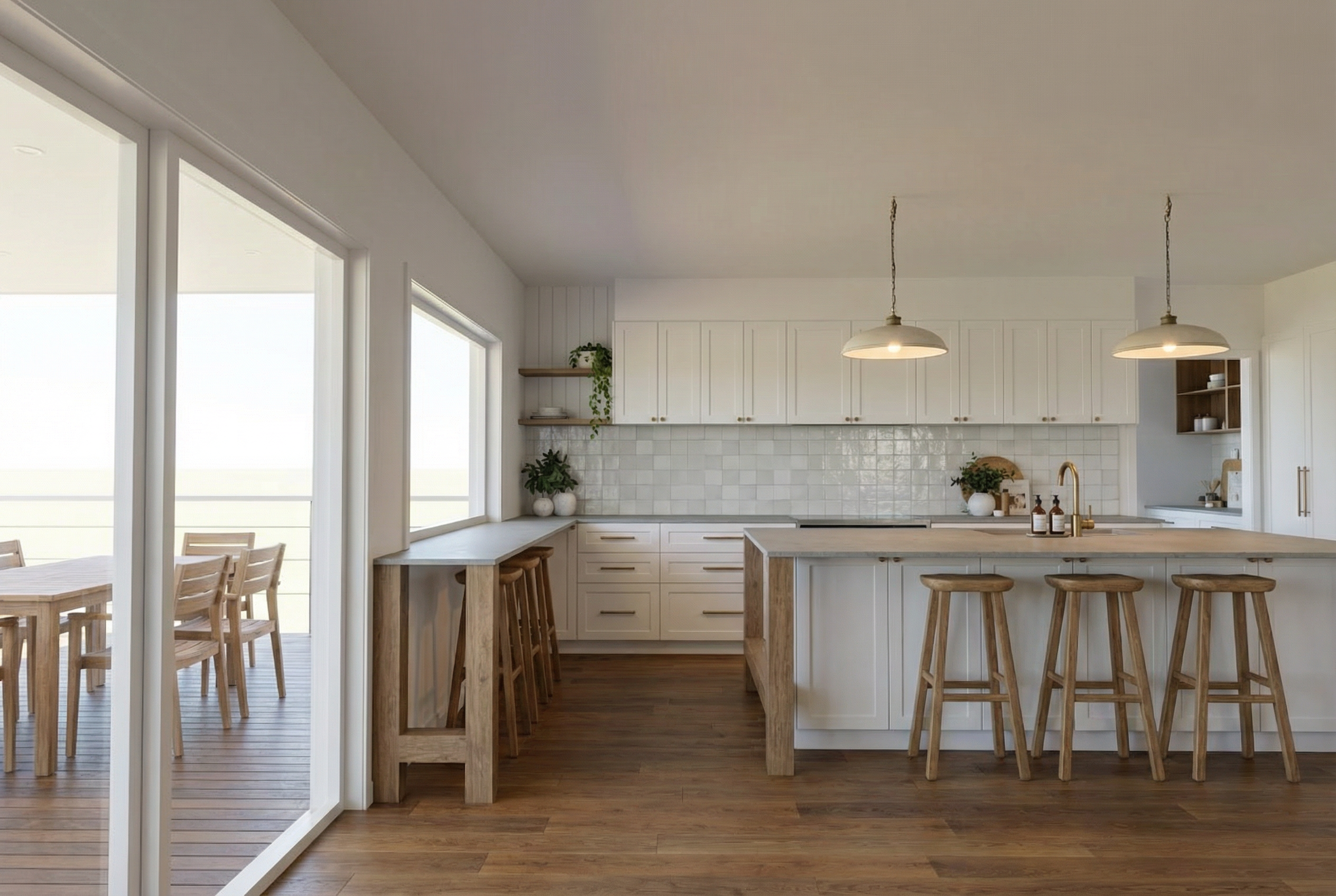 all cabinetry to be white shaker style pendant lights are these https lightingcollective com au products traditional ceramic pendant assorted size stone bench top to be https www caesarstone com au colours 4001 fresh concrete hand soap near kitchen tap is https alivebody com au products kitchen trio lemon pomegranate variant 43810328314096 country au currency aud tp cid 22748875176 tp id 762054959221 tp pid shopify au 8213717549296 43810328314096 tp source google gad source 1 gad campaignid 22748875176 gbraid 0aaaaab01yxqhra7btn0qohrmvf8mq dro gclid eaiaiqobchmi3frx89lfkgmvtmjmah3j5xlzeayyasabegisyfd bwe splashback tile is https dilorenzo com au products zelij collection chalk gloss 100x100mm please add some nice outdoor furniture to the outdoor deck and some landscaping there is a rail that runs in line with the kitchen please also include two horizontal skylights between the back cabinetry run and island bench timber finishes to be light oak