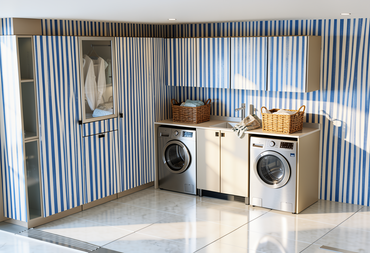 cambiar todas las paredes a un papel que se utilice en cuarto de lavado a rayas combinado rayas blancas y azules cambia todos los muebles a un mismo tono beige suave cambia tono del papel aun tono azul mas suave cambia suelo mas gris suave toda la habitaci n con el mismo papel a rayas combinadas beige y azul muy clarito