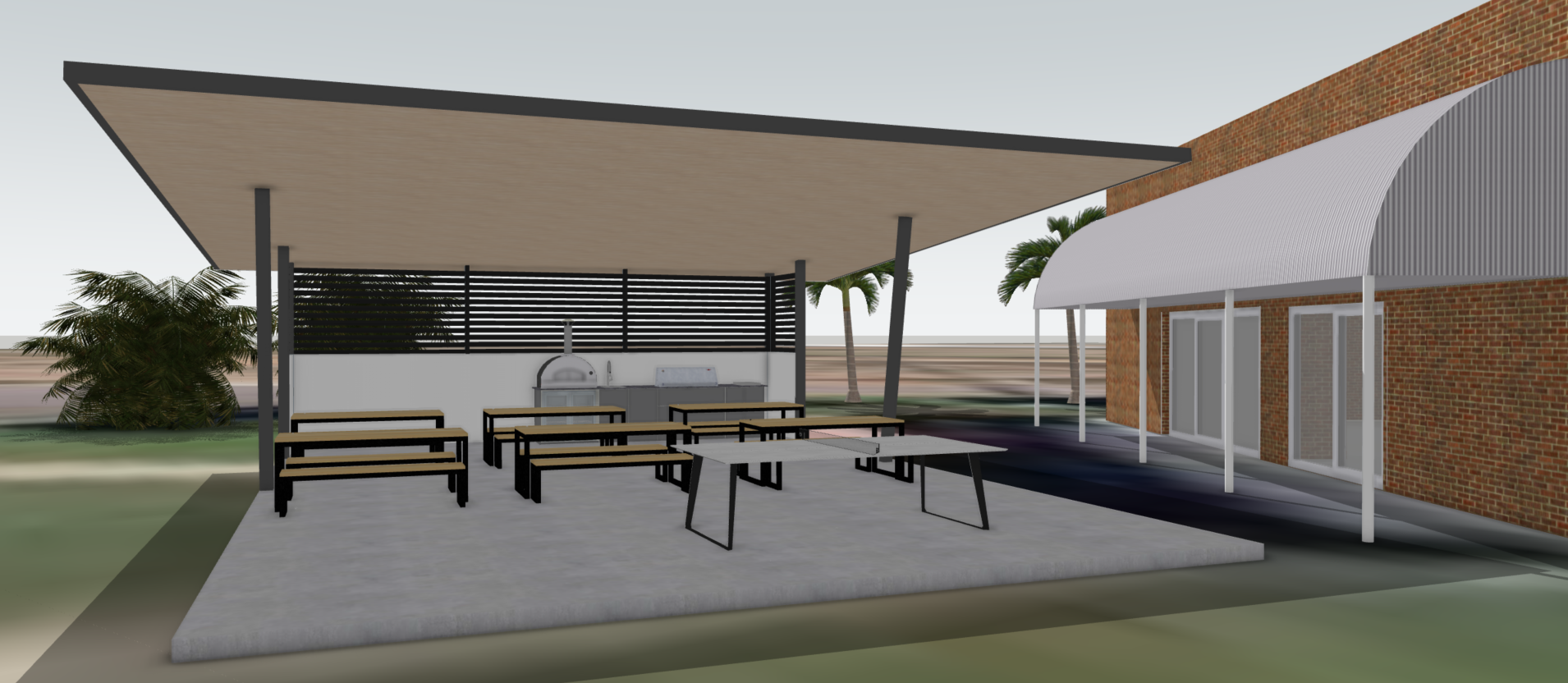 sunny short grass natural shrubs around concrete slab people sitting at benches strong shadows