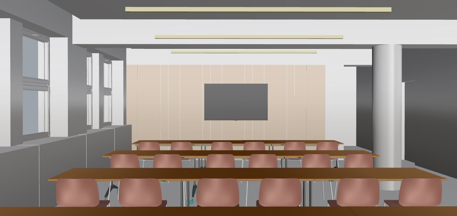 photorealistic interior render of a modern fresh and attractive conference room contemporary european office design high end architectural visualization clean calm and inspiring atmosphere the ceiling composition and all structural beams must be exactly identical to the reference image maintain the same ceiling layout proportions beam positions and construction logic as shown in the base reference image strictly follow the reference without creative reinterpretation floor finished with a uniform technical carpet in neutral grey color fine subtle texture matte finish seamless surface conference tables are flip top folding tables by narbutas with anthracite metal frames and white tabletops minimalist and functional design clean sharp edges professional appearance seating consists of babila chairs by pedrali all chairs are in one single color tone soft muted terracotta monochromatic execution legs and seat in the same terracotta shade warm elegant and fresh adding subtle character without overpowering the space under the windows are custom radiator covers with white top board 18 mm thickness front vertical panels made of white fine perforated metal or white expanded metal precise detailing technical and minimalist expression behind the wall mounted tv is a feature wall cladding visually emphasized as an orange accented zone the wall is finished with fine whitewashed natural oak panels vertical grain subtle natural texture matte finish the oak surface adds warmth and material depth while remaining calm and refined clean detailing around the tv concealed cables seamless integration lighting design includes warm ambient led lighting running in clean linear lines along the structural beams starting from the window side and continuing towards the opposite wall enhancing depth and spatial continuity additionally primary suspended linear pendant lights slim and subtle warm white light evenly illuminating the conference tables large windows provide soft natural daylight balanced exposure realistic reflections global illumination soft shadows wide angle interior shot eye level camera professional architectural photography style ultra high realism sharp details no people no clutter