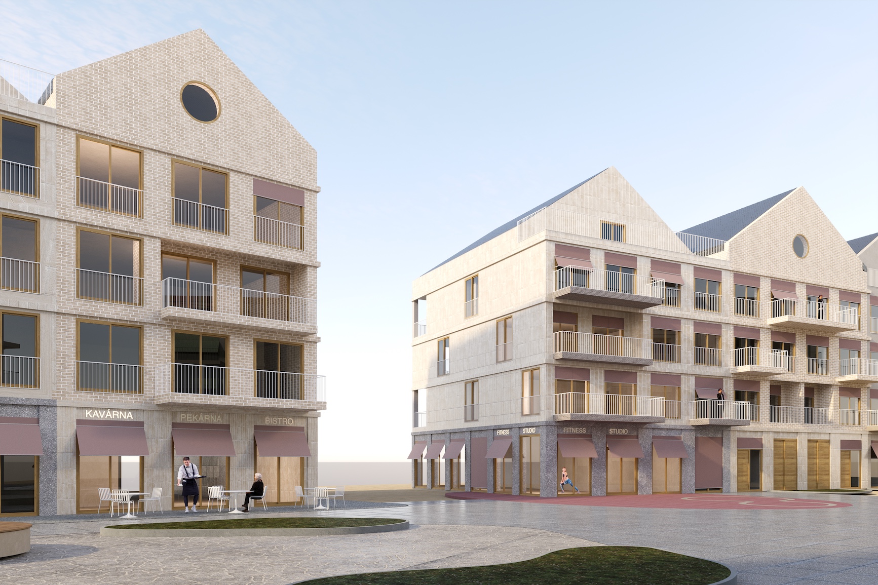 preserve original viewpoint framing and perspective realistic daytime architectural exterior render soft natural light with gentle shadows mixed use residential buildings with light beige brick and stone facades large windows and balconies with metal railings ground floor commercial spaces featuring a cafe on the left corner with outdoor seating and awnings fitness studio on the right corner with large glass entrances surrounding landscaped green areas with bushes and curved planting beds red rubberized outdoor simple playground integrated into the paved courtyard area spacious pedestrian plaza calm clear sky photorealistic quality lights from interiors reflections of sky in the windows