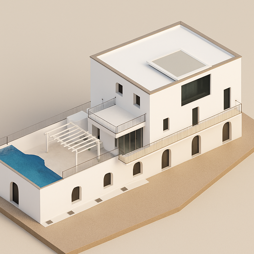 religion architecture photorealistic render raw concrete wall oak furniture mosaic floor glass table sun light from right side old lady sitting on bench