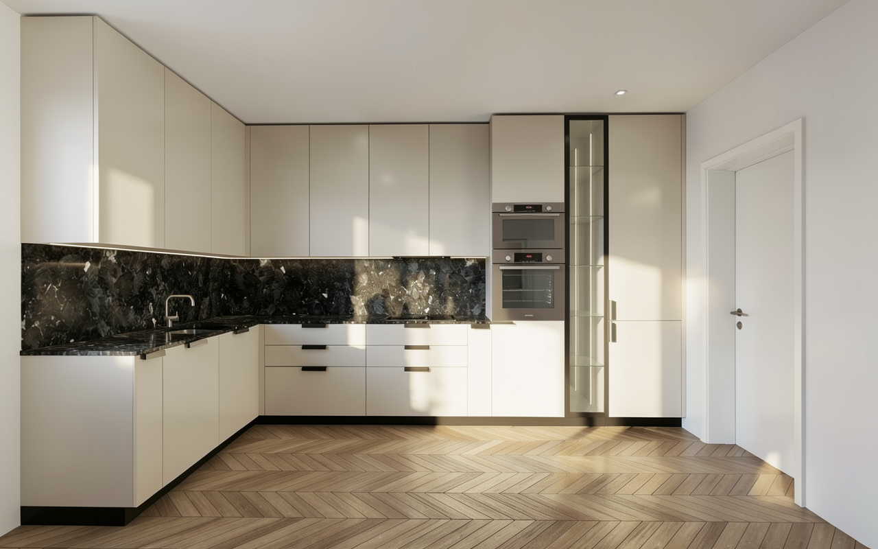 transform this modern outdoor caf patio with a mediterranean spanish vibe introduce elegant red umbrellas with subtle white embroidered edges evenly distributed across the seating area replace existing chairs with black metal frame chairs combined with warm wood elements styled with red and white striped cushions add small round caf tables with dark metal bases and light stone or wood tops enhance the floor with textured natural stone tiles in warm grey beige tones slightly irregular for an authentic feel include lush greenery in terracotta pots climbing plants near the fa ade and soft shadows for a warm afternoon ambiance lighting is soft mediterranean sun realistic high end architectural visualization ultra detailed 4k natural materials cozy yet refined atmosphere add red umbrellas at the chairs and tables whole area