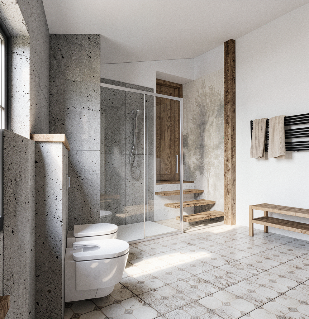 professional architectural photography of a modern bathroom photorealistic 8k resolution natural daylight streaming from an invisible window on the left soft shadows airy atmosphere materials raw grey concrete wall panels natural oak wood grain on stairs and pillar vintage patterned ceramic floor tiles with matte finish white porcelain toilet and bidet transparent glass shower partition with chrome hardware background wall features a subtle grey forest landscape mural on textured linen wallpaper high end finishes clean minimalist aesthetic neutral color palette nie dodawaj nic do obrazu geometria ma pozosta dok adnie taka sama