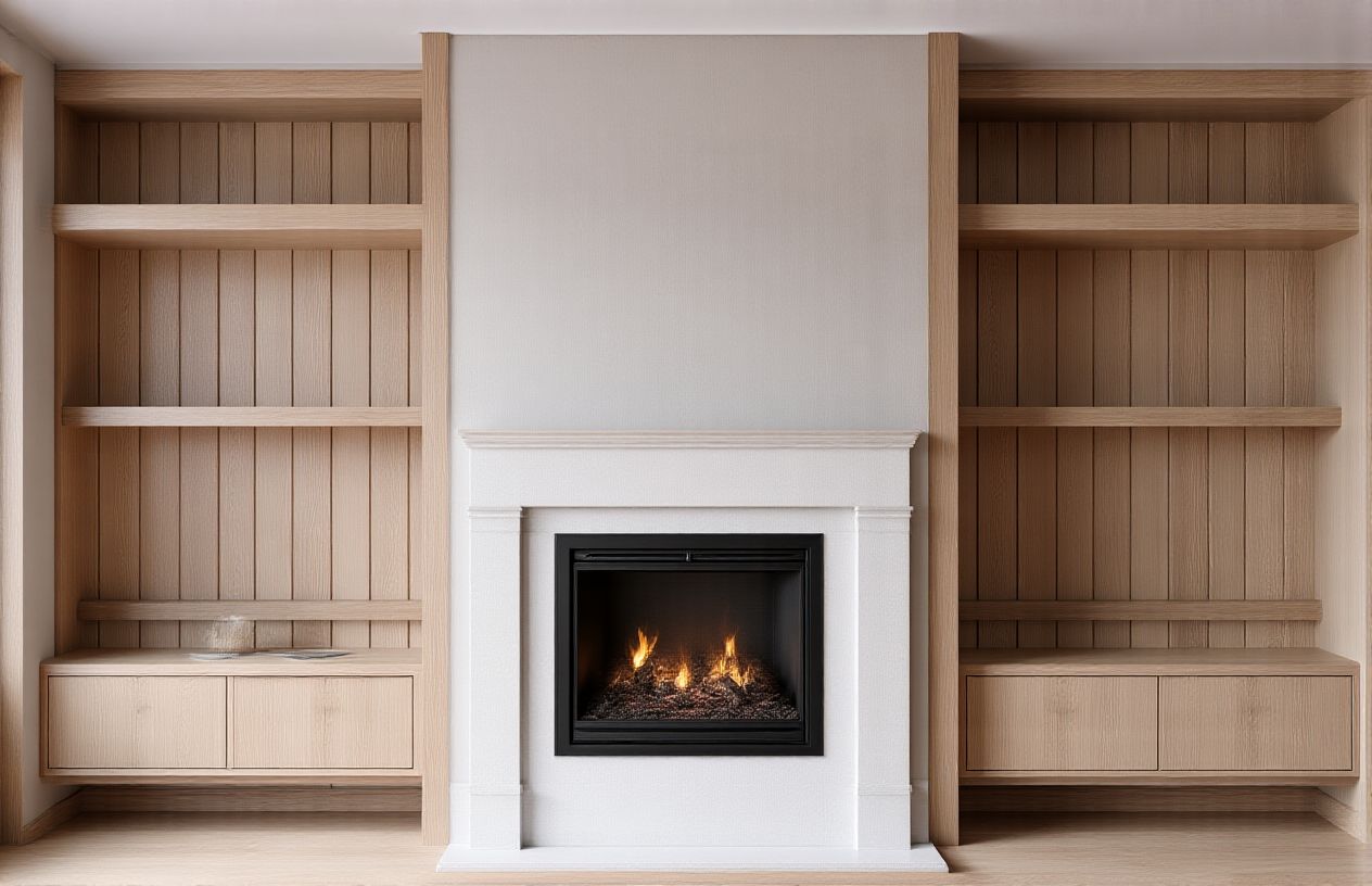 add lighting under shelves make the fire in the fireplace more realistic make the sofa linen remove the lines from the cabinets under the fireplace