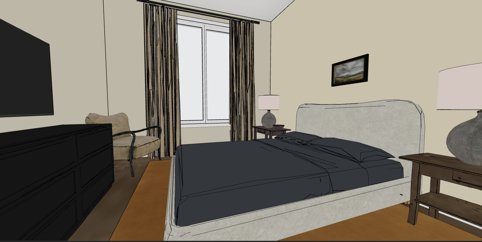 create a serene bedroom environment with warm neutral tones the walls are farrow and ball school house white the room is north facing enhancing the cozy atmosphere dress the bed in deep charcoal bedding nightfall by quince and provide a european bed topping with the duvet going over and tucked over the bed pillows the room should read editorial sophisticated the curtains are two pages tapioca flanking the window that lets in gentle natural light the floor is a warm european wide plank brown oak wood adding an earthy feel a modern black dresser sits to the left balancing the room with a sleek touch an armchair with black metal arms complements the setting the nightstands are dutch antique dark brown wood topped with soft gray lamps with lots of texture that cast a warm glow a small underscale painting with muted greens and grays decorates the wall above the bed the overall ambiance is peaceful and harmonious but sophisticated design for ideal for relaxation do not change pieces beyond this and keep the room scale in tact