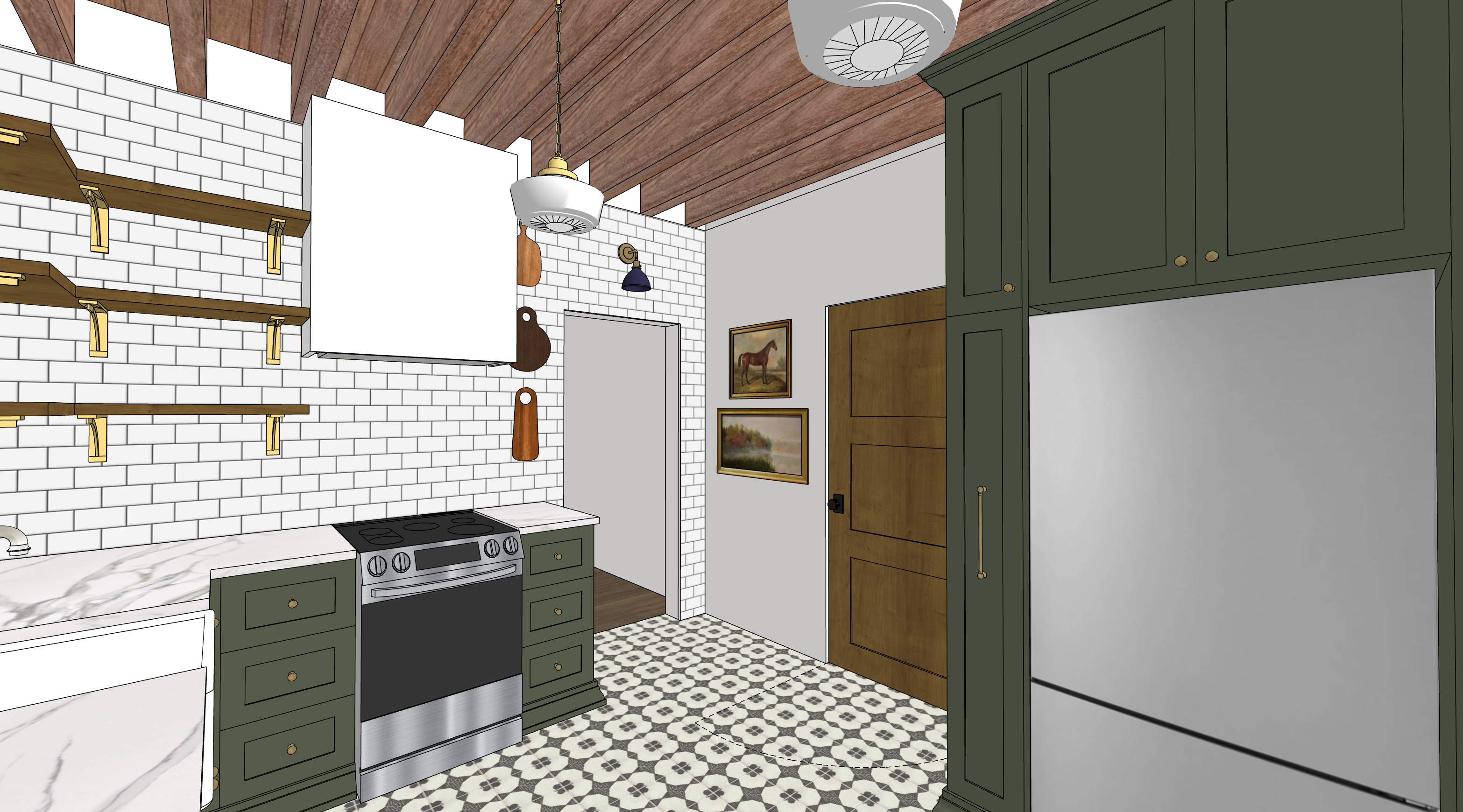 i want the morning light shining through there is a window accross the stove the tile on the wall is a 3x6 glossy white subway tile with dark gray grout for contrast i have a geometric mexican tile on the floor to compliment the subway tile make sure that the pattern stays the same i want all the lights to have a soft glow on it put a cat on the counter to the right of the stove and style the florting shelves make note that the hallway flooring is hardwood past the open door way and the tile is only in the kitchen