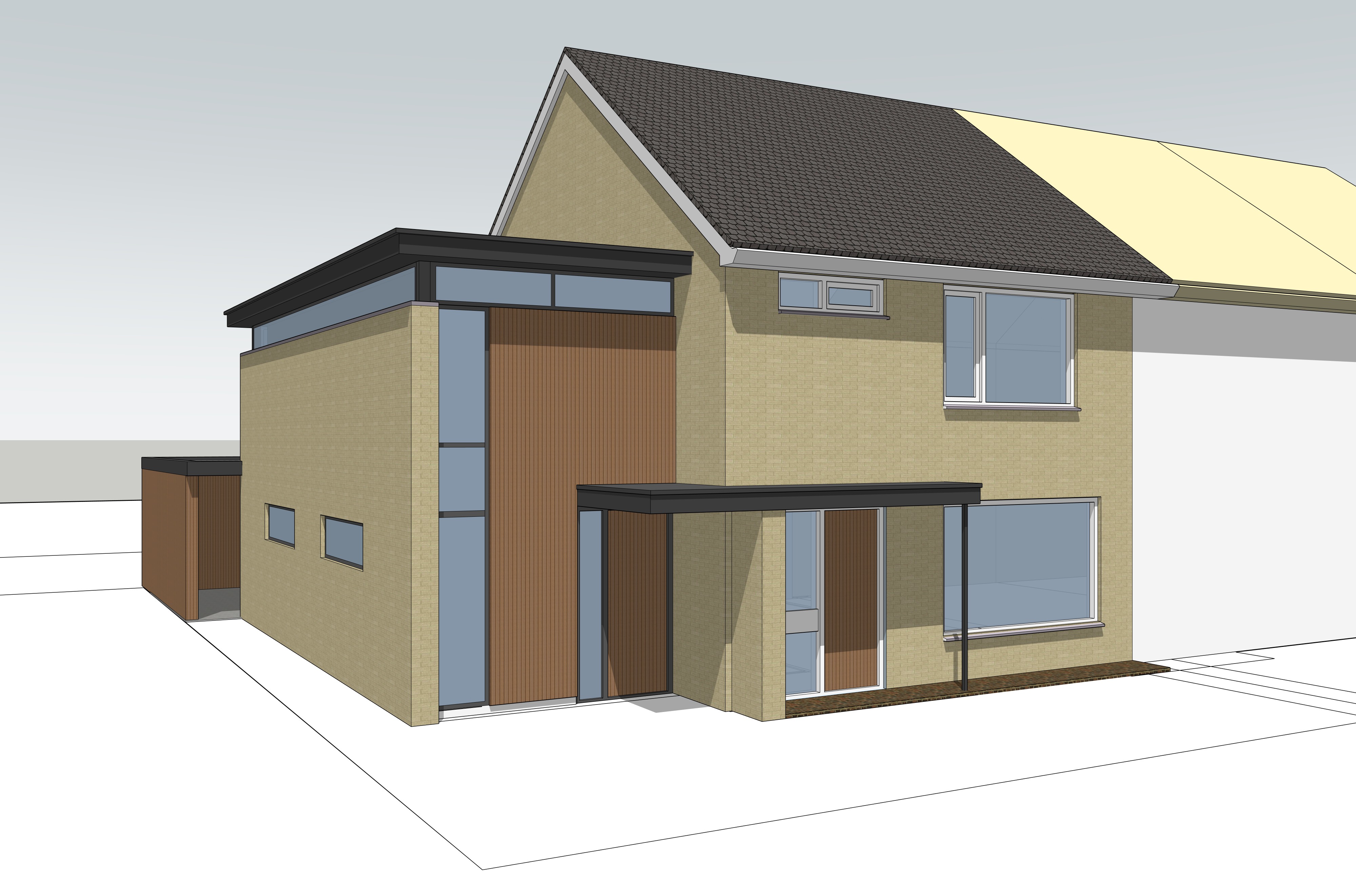 make a photorealistic rendering of this house make the horizontal roof edge in dark steel keep the roof edges of the sloped roof white add some people and trees bushes and flowers the sloped roof is covered in dutch roof tiles the vertical wood panels are made of narrow vertical natural wood boards make the viewpoint a little bit lower
