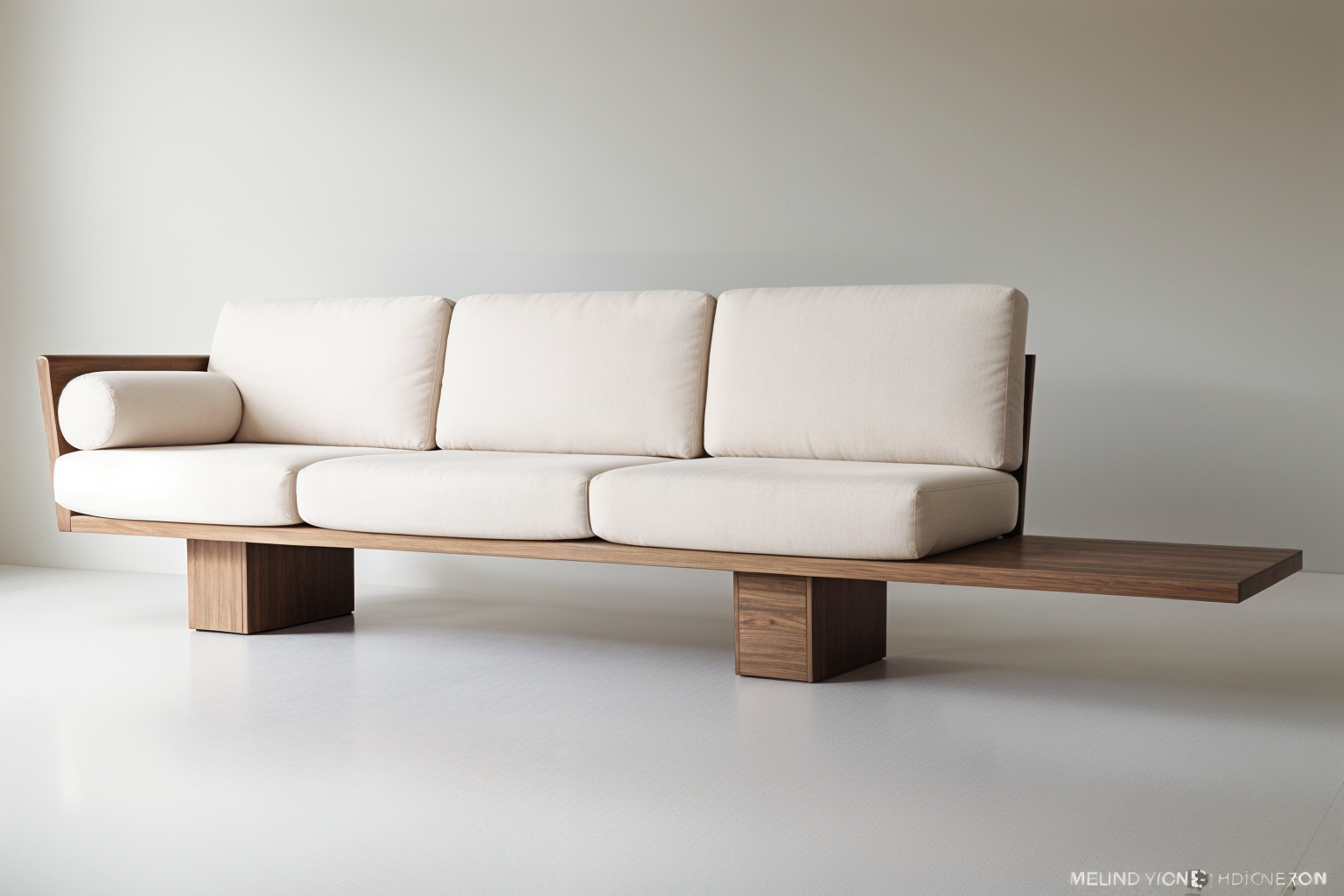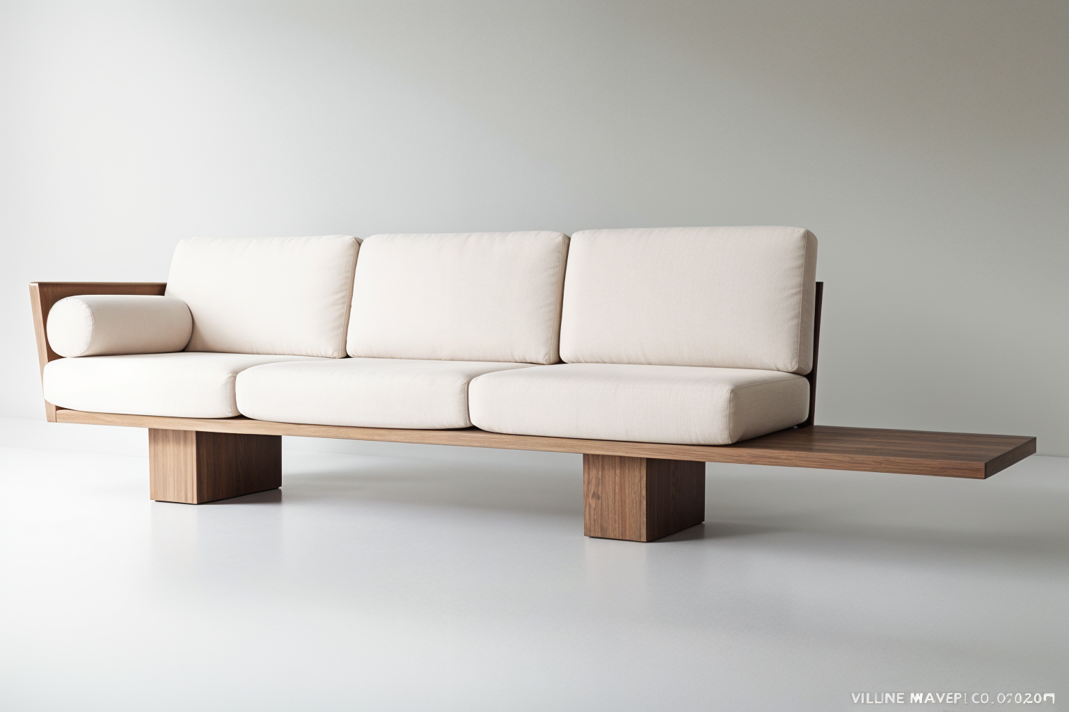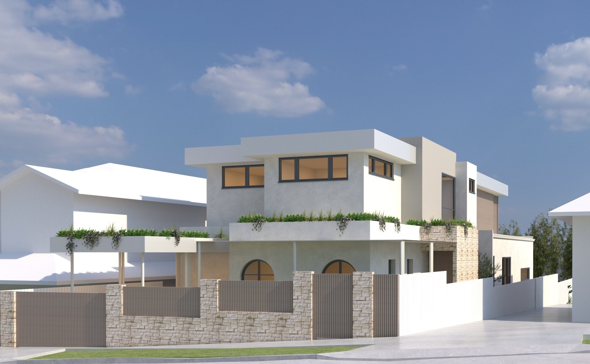 contemporary exterior shot modern two story house with minimalist design white and light beige exterior walls stone accents in soft cream and dark wood framed windows lush green plants adorn the rooftop and porch area offering a pop of nature front yard has a stone and wood fence in natural tones the sky is clear with bright blue hues and scattered fluffy white clouds atmosphere is serene and sunny showcasing the elegance of contemporary architecture with a cozy inviting feel architecture