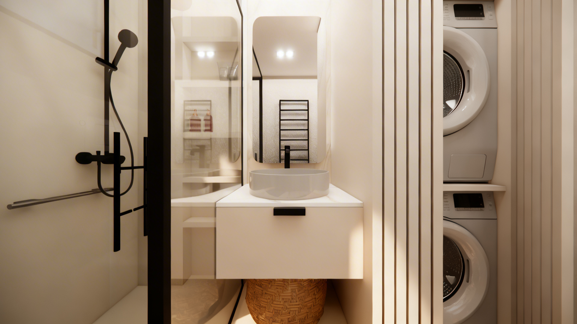 crea una imagen fotorealista a partir de esta de sketchup realza las texturas e iluminacion para que queda todo natural y realista a ade ilimunacion en el foseado del techo que aparece al fondo en el salon y una tira led donde la linea arriba en la pared derecha las semiesferas de colores son apliques a adeles iluminacion tenue