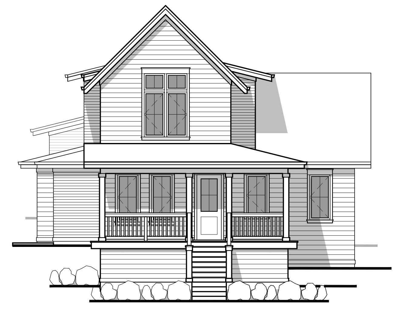 please follow the drawing render this house with a white body white windows white trim white fascia black roof black white columns black front door leafy shrubs large bushes lavender plants no green grass large boulders