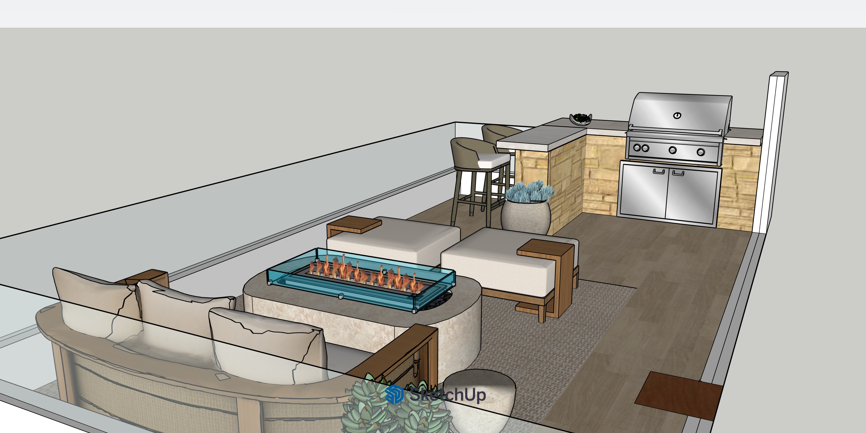 realistic rendering of the sketchup model of a beach house balcony on second floor in first image with a view of the beach in the background at golden hour the beach is to the left you can see mountains in the far distance