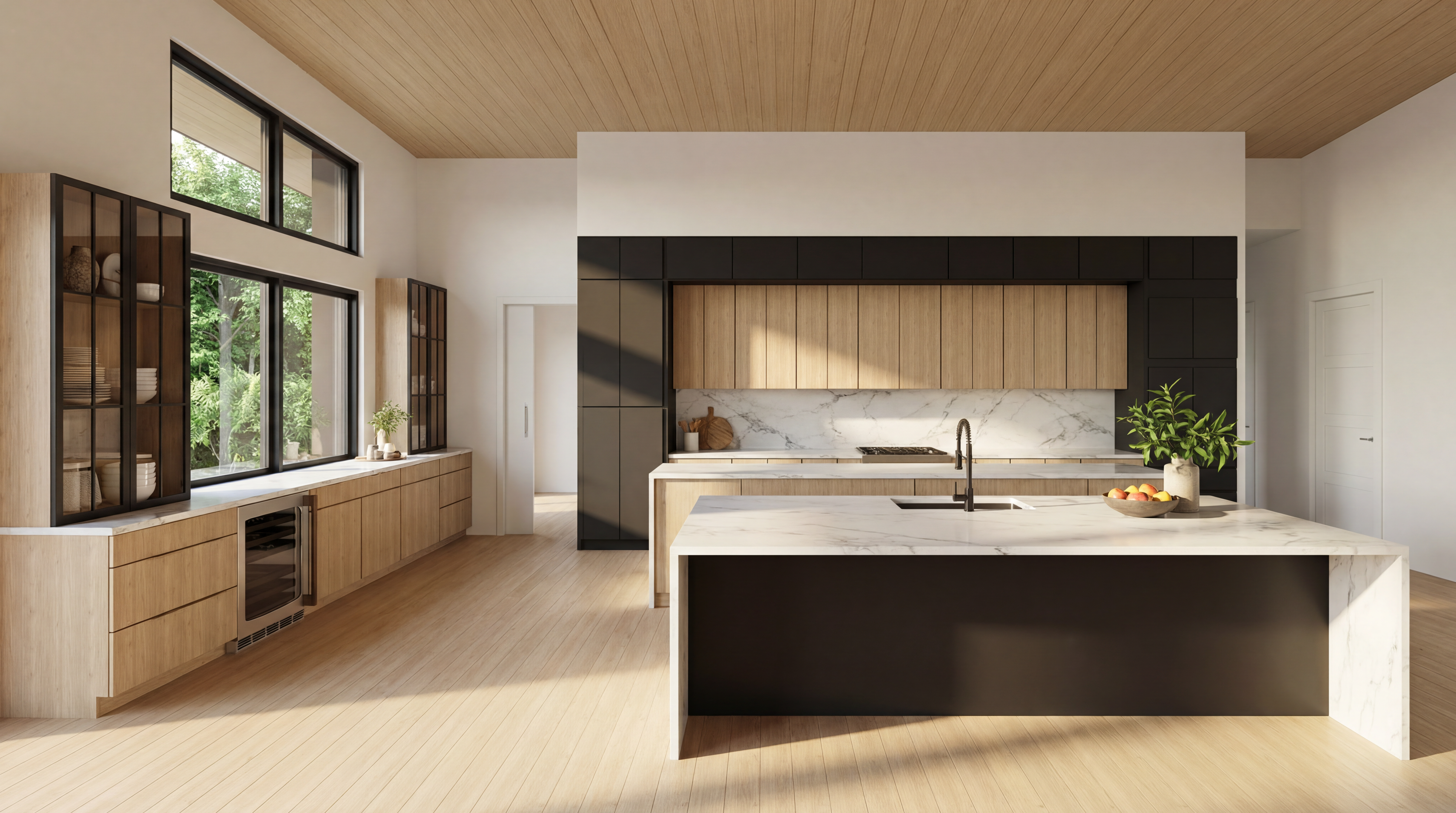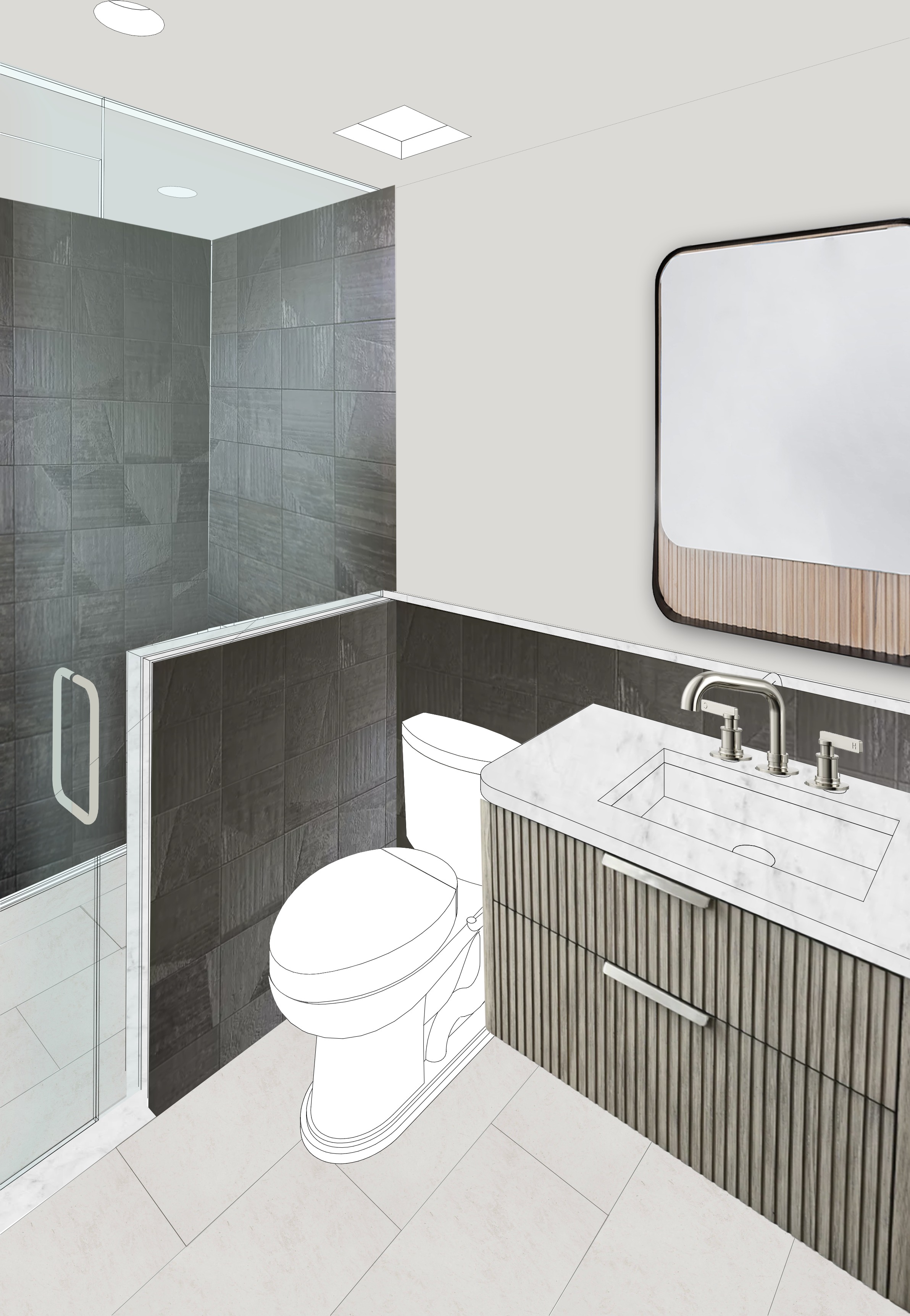 photorealistic render of a basement bathroom with no natural light illuminated only by recessed ceiling lighting and wall sconces neutral balanced lighting with soft shadows and accurate falloff shower walls and wainscoting clad in ann sacks oriana 6 x 6 black field tile shown in a clean stacked installation with subtle tonal variation and a handcrafted ceramic texture floor finished in porcelanosa montreal white nature tile with a matte light stone appearance vanity in grey washed oak with vertical fluted detailing sink faucet is kohler castia widespread bathroom faucet in polished nickel all hardware and plumbing fixtures are polished nickel strictly maintain given materials finishes and fixture specifications do not introduce additional architectural elements furnishings d cor or layout changes do not alter proportions or scale highly realistic materials accurate texture mapping true to life reflections and natural surface variation soft controlled artificial lighting only high resolution photorealistic quality with ray traced lighting and global illumination