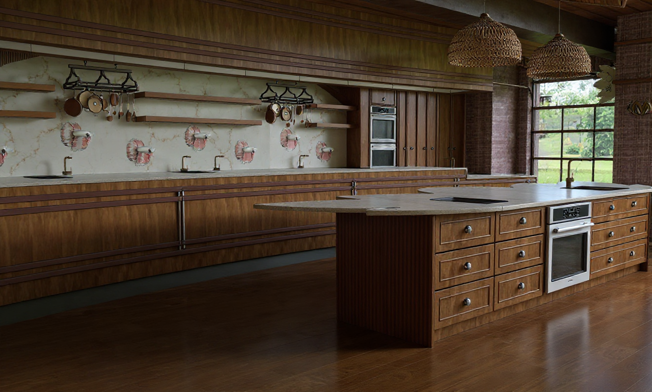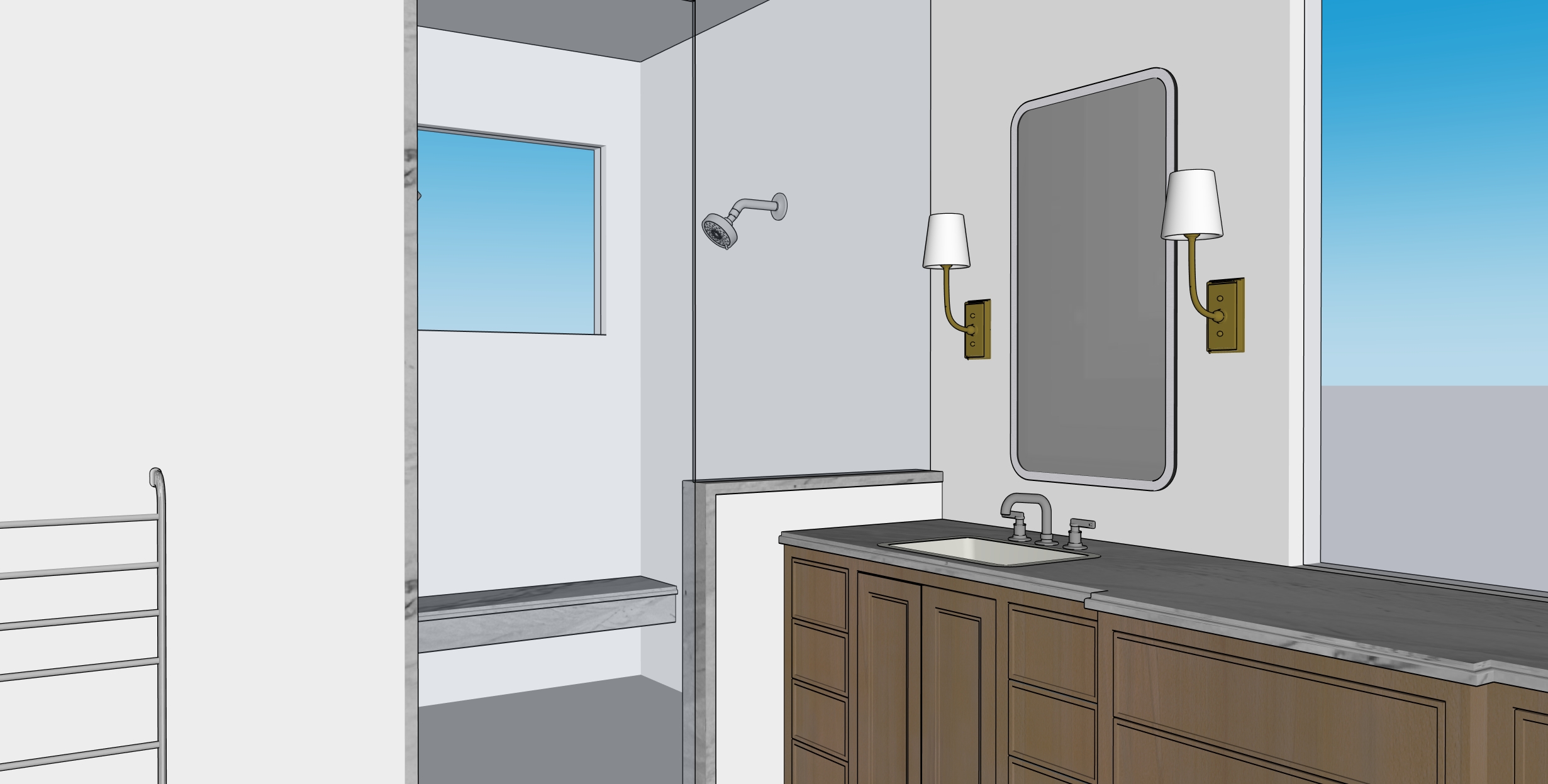 interior shot render this exact image with photorealistic materials and lighting use a light colored marble tile on the walls and a light colored marble on the countertops