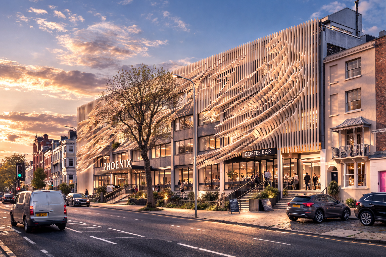 without changing the pattern and overall sculptural formwork can you add more realism and quality to this visual keeping the phoenix coffee signage intact
