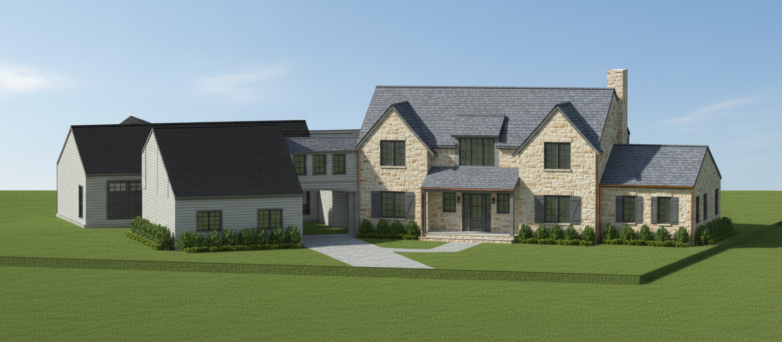 exterior shot keep the building and windows the same as the source drawing use the mood board for materials and landscape setting