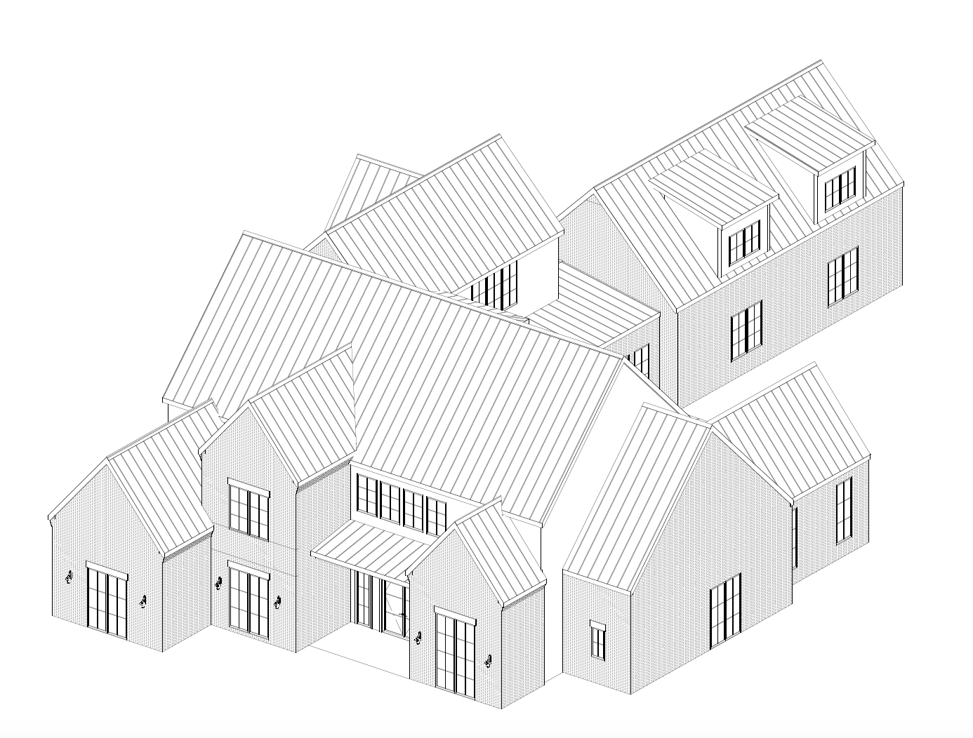 classical exterior shot standing seam metal roof old world brick and stucco exterior landscaped yard architecture