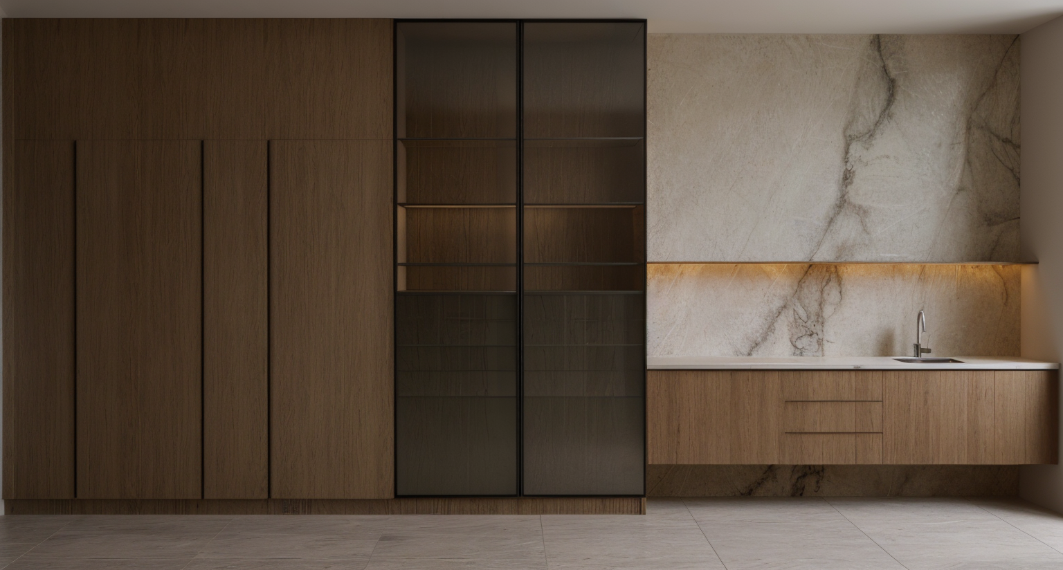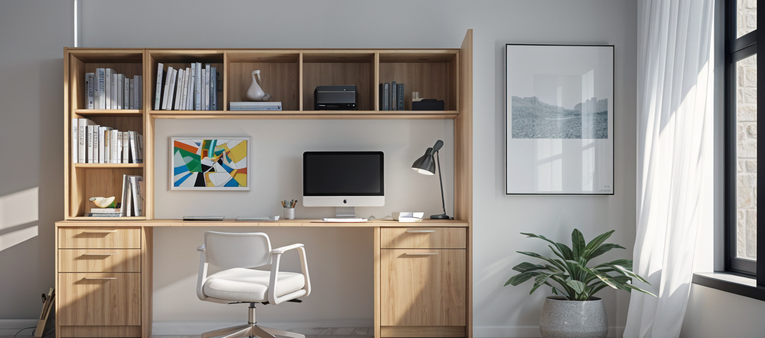 modern interior shot compact home office nook in a modern townhouse neutral palette floating wood desk laptop setup framed artwork of bc landscapes soft led lighting comfortable and functional design urban canadian style architecture