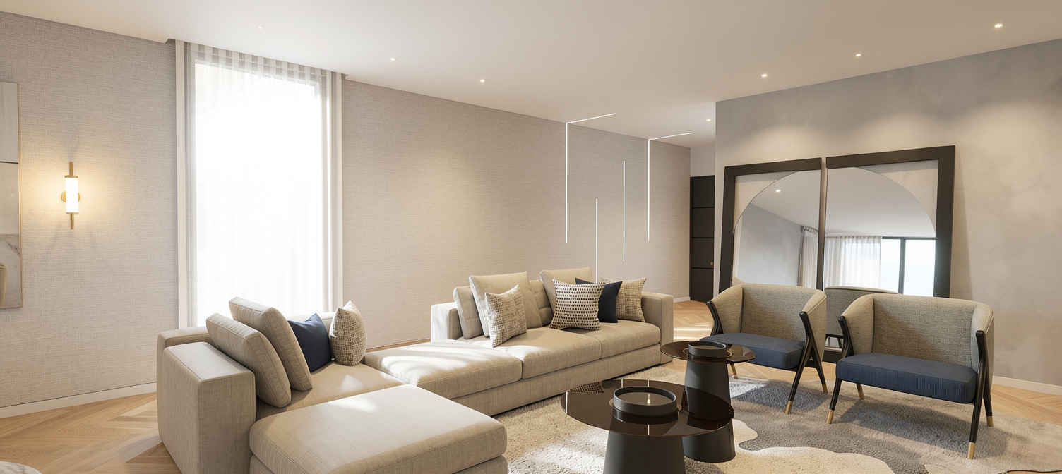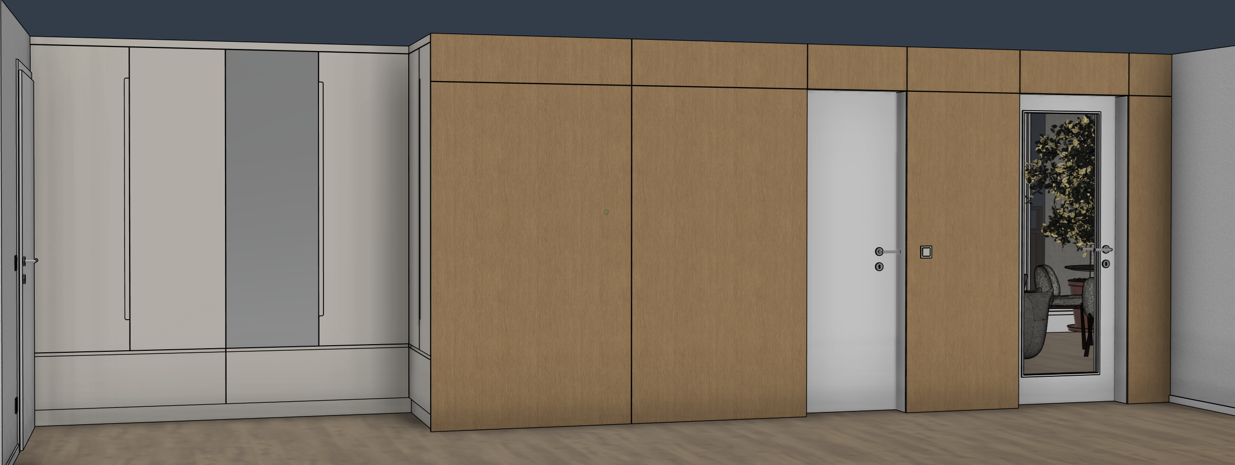 use the provided screenshot strictly as the base image keep the exact camera angle layout proportions wall positions door positions and furniture placement do not modify the architecture or geometry convert the scene into a highly realistic render of a modern minimalist apartment hallway on the left side of the image there is a built in wardrobe the wardrobe doors are in a chalk color soft warm off white matte finish the wardrobe has integrated routed handles milled handles the handles are not separate elements they are recessed grooves milled directly into the wardrobe doors creating a vertical grip that is pressed into the surface of the door the handles should appear subtle minimal and carved into the door panel one of the wardrobe doors contains a full height mirror panel integrated directly into the wardrobe door the mirror should behave as a realistic reflective surface the wardrobe base panel below the doors is also in the same chalk color the floor is natural oak wooden flooring with long planks and a matte finish the oak tone is warm and natural with a subtle calm grain in the center and right side of the image the wall is covered with large oak wood cladding panels that create a flush wall surface with integrated doors the oak has a subtle radial grain and a calm elegant texture the interior door in the middle of the wooden wall is plain white with a smooth matte finish and minimal modern hardware on the right side there is another white door with a tall vertical glass panel walls that are not clad in wood are smooth white plaster with a soft matte finish lighting should be soft and natural with daylight entering from adjacent rooms combined with subtle warm interior lighting use realistic global illumination natural shadows and physically accurate materials to create a calm contemporary residential atmosphere do not add remove or reposition any architectural elements