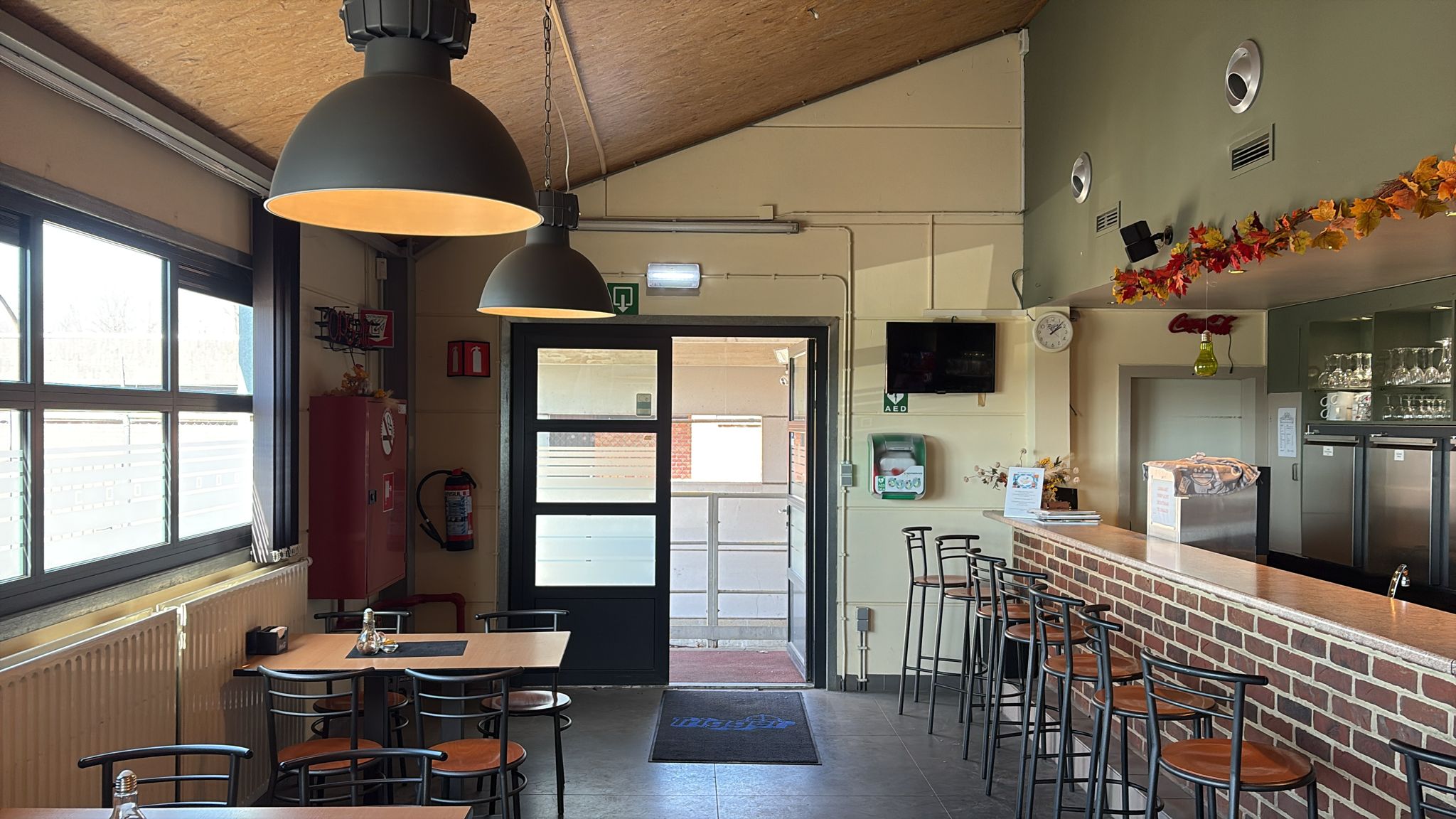 keep the doorway and tables as they are in the picture the bar keeps the same shape ceiling will be lower and straight with trackrails in black