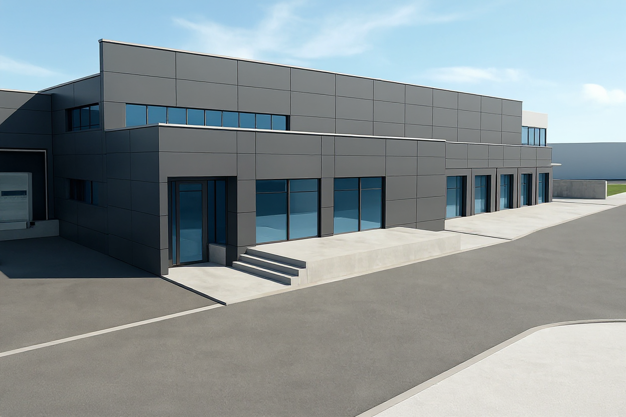 hyper realistic render of the same modern industrial building same camera angle same composition and lighting keep the dark grey facade panels and blue reflective glazing on the rest of the building replace the five fa ade openings on the right side of the front elevation with vehicle loading docks install five large sectional overhead dock doors with horizontal panels dark grey color each with a concrete loading platform steel bumpers dock levelers and rubber dock seals around the doors add vertical safety bollards on both sides of each dock yellow safety markings on the pavement in front of every dock and a slightly darker shadow under the upper volume keep the road foreground asphalt and sky exactly the same no trucks no people clean and minimal industrial look