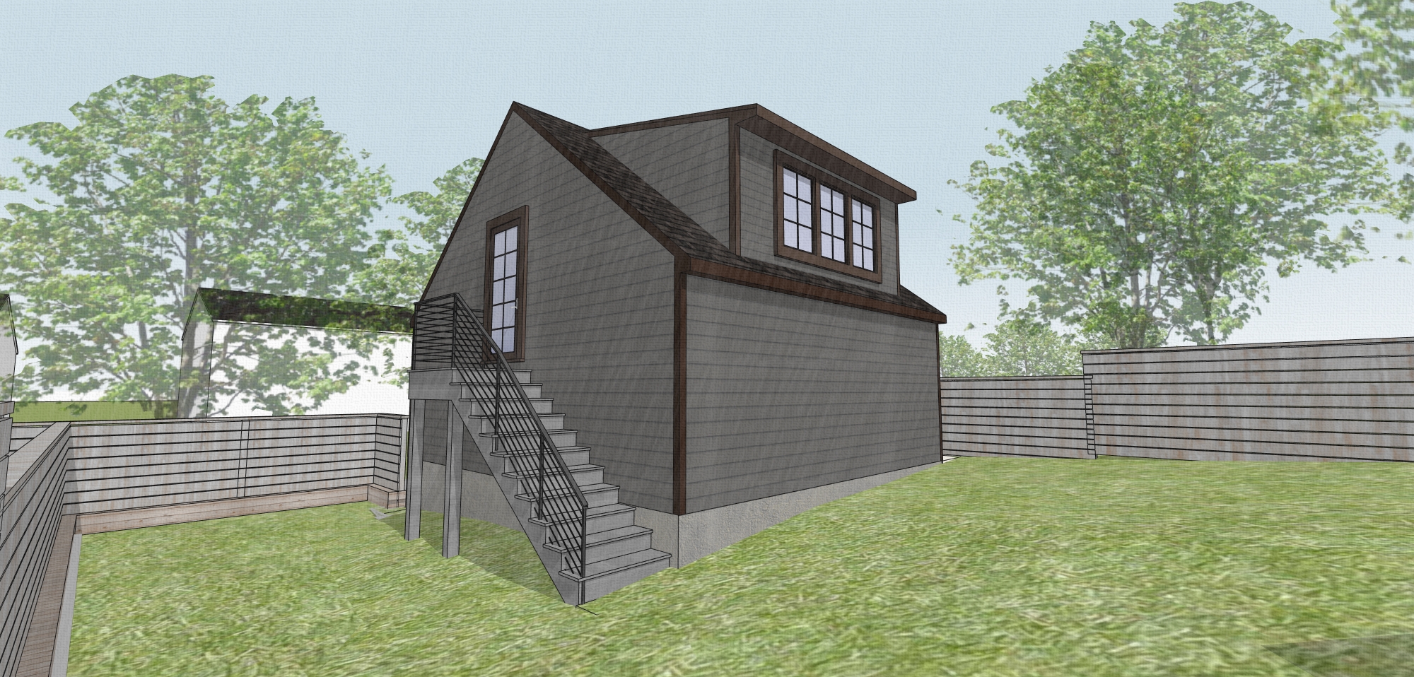 realistic gray brown siding and dark brown trim bright sunny day light wood fence and wood stairs