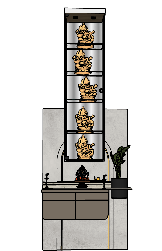 interior shot shows a vertical pooja unit designed with a sleek modern aesthetic the top unit is a tall glass enclosure with multiple shelves each displaying an idol the glass shelves and enclosure allow for clear visibility of the idols creating an elegant and inviting display below the glass section a sturdy marble base with a smooth finish offers additional space for rituals the marble has a subtle sheen adding a touch of luxury a back mirror within the marble section enhances depth and reflects light creating a spacious feel