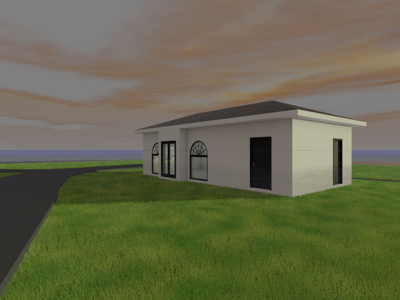 modern mediterranean single story building with cream stucco walls and dark tiled roof arched windows and a central arched entrance with black metal frames soft neutral colors beige ivory with minimal landscaping and clean paved ground warm natural light golden hour soft shadows calm and elegant atmosphere