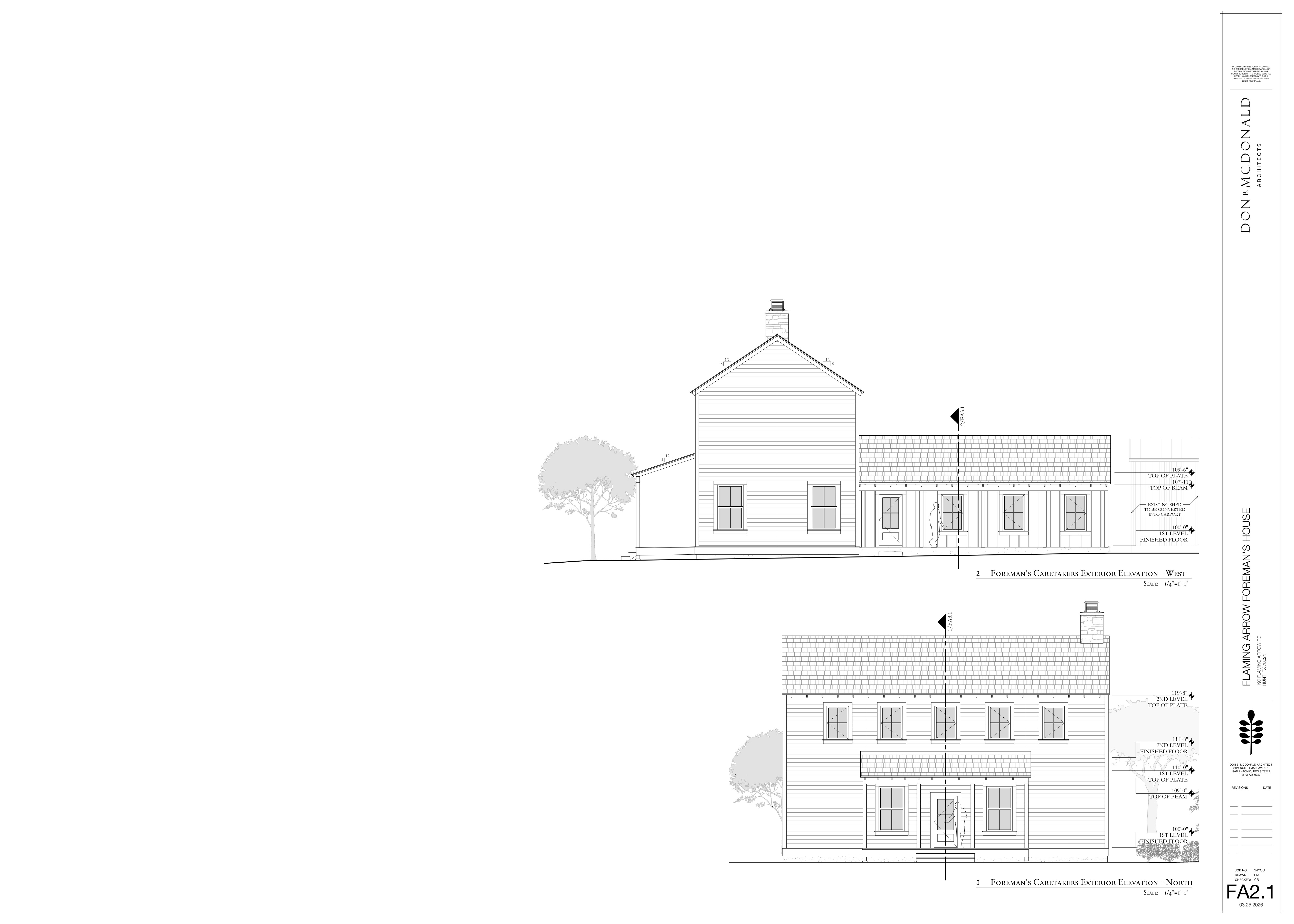 make a hand colored render of the north elevation with landscape from the texas hill country with a hillside on the left and dence native planting on the right