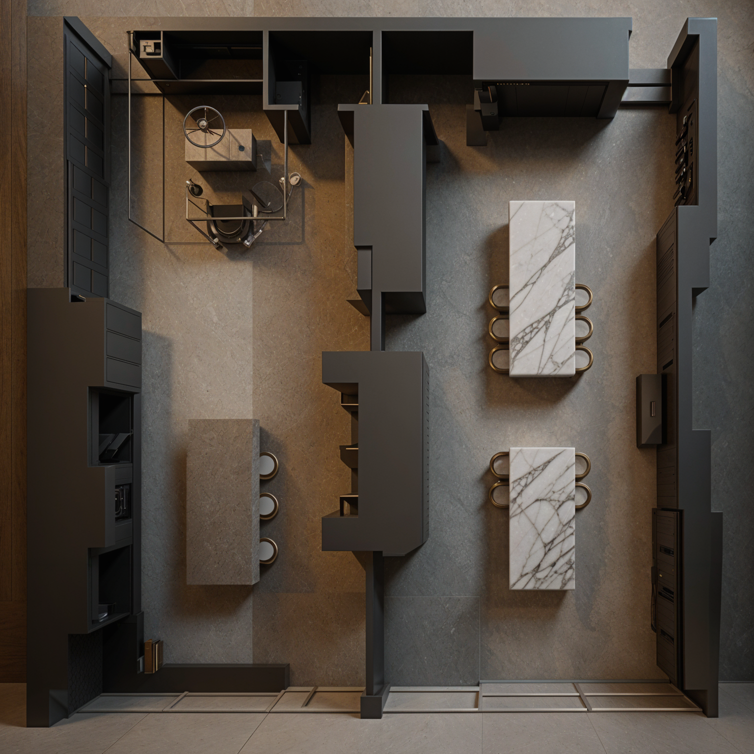 realistic architectural render of a contemporary wellness center with three levels above grade and one underground level located on av patriotismo mexico city the main building is composed of clean rectangular volumes with curtain wall fa ades linear balconies and open terraces the ground floor accommodates a healthy market caf wellness shop and pedestrian access from the avenue the upper levels contain yoga and pilates studios a spa and an emotional health clinic the underground level serves as a parking garage accessed via a vehicular ramp descending from av patriotismo and exiting toward pablo ucello street the basement is designed with exposed concrete retaining walls integrated lighting and natural mechanical ventilation for functionality and safety the exterior landscape is a key feature an organic garden layout with curved stone pathways connecting three circular plazas a central fountain and green areas with symmetrically arranged trees additional program elements include a zen garden children s playground and pet park the architectural style is natural minimalist using materials such as stone exposed concrete and light wood combined with abundant vegetation to create a relaxing and harmonious atmosphere daytime lighting with clear sky conditions emphasizes well being openness and connection to nature the central opening on the front fa ade at street level must be clearly designed as the vehicular entrance to the basement parking garage with a ramp descending directly from the sidewalk avenue remove any elevated effect the access should align naturally with the ground level emphasizing the underground functionality architecture