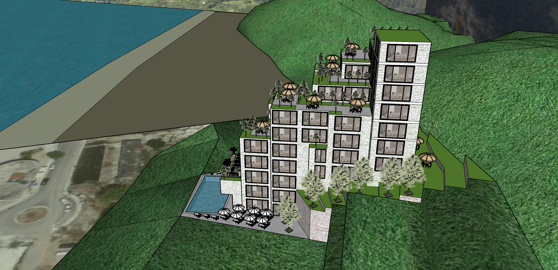 render a stunning architectural resort nestled in lush green mountains featuring cascading terraces with light grey stone walls put large tall and wide glass doors overlooking the terraces and also many windows in all the walls windows and doors have to prevail over the facade each terrace is adorned with vibrant green lawns and elegant parasols in soft beige the surrounding trees are a mix of muted silver and deep green foliage incorporate a luxurious inviting pool at the base with clear blue water the atmosphere exudes tranquility and harmony with nature with soft natural lighting emphasizing the serene setting please fill the surrounding hills with olive trees and some houses make it an elite residential zone render a stunning architectural resort nestled in lush green mountains featuring cascading terraces with light grey stone walls put large tall and wide glass doors overlooking the terraces and also many windows in all the walls windows and doors have to prevail over the facade each terrace is adorned with vibrant green lawns and elegant parasols in soft beige the surrounding trees are a mix of muted silver and deep green foliage incorporate a luxurious inviting pool at the base with clear blue water the atmosphere exudes tranquility and harmony with nature with soft natural lighting emphasizing the serene setting please fill the surrounding hills with olive trees and some houses make it an elite residential zone