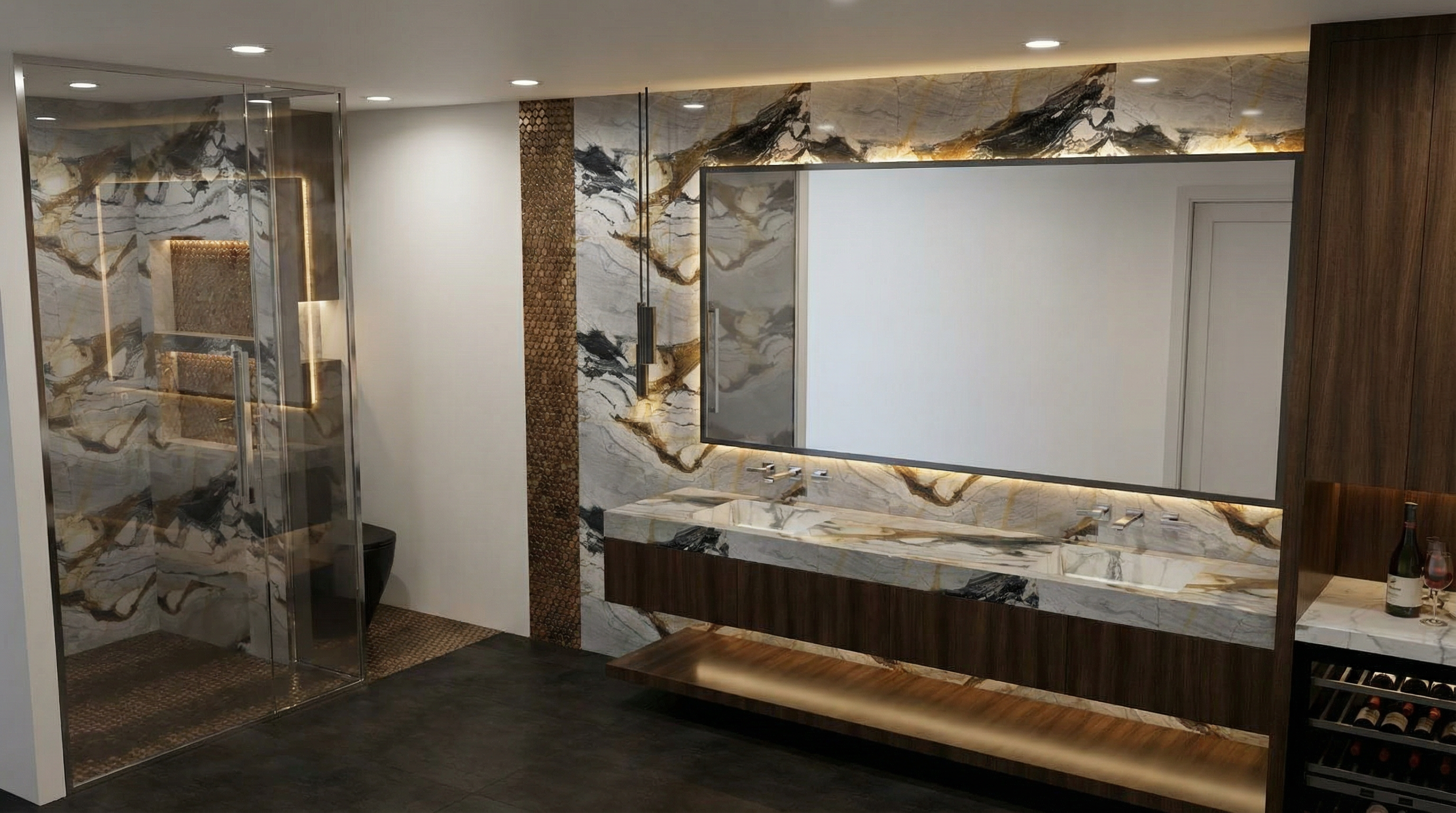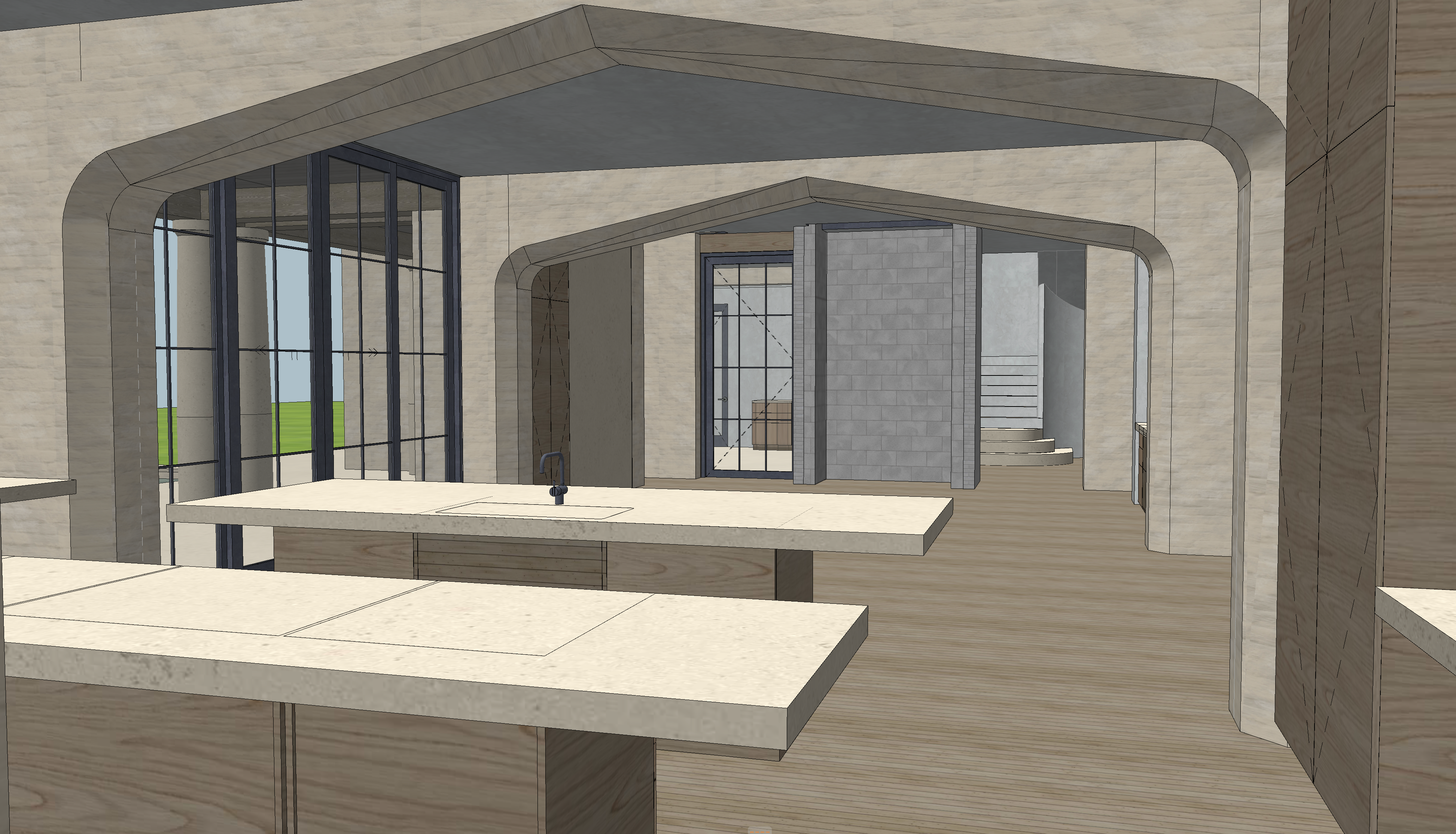 tan limewashed brick wide plank wood flooring marble countertops white oak cabinetry