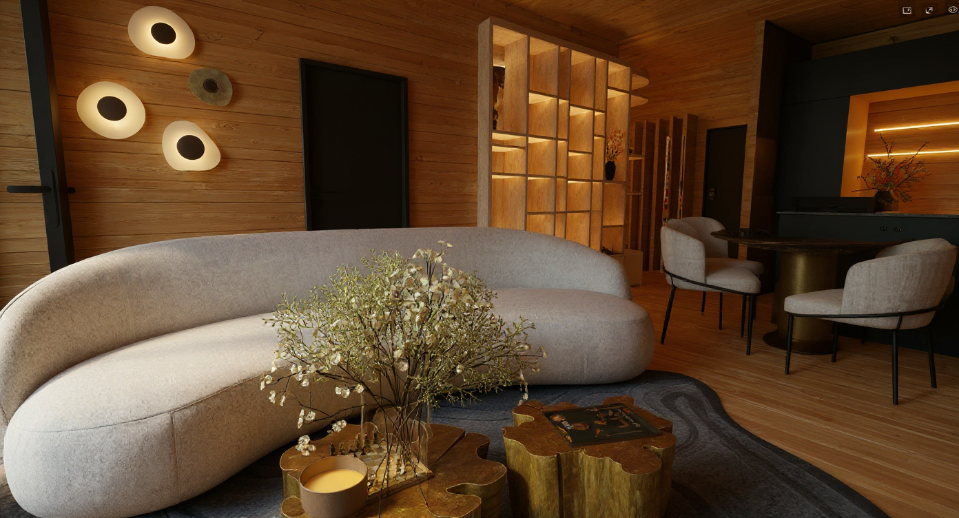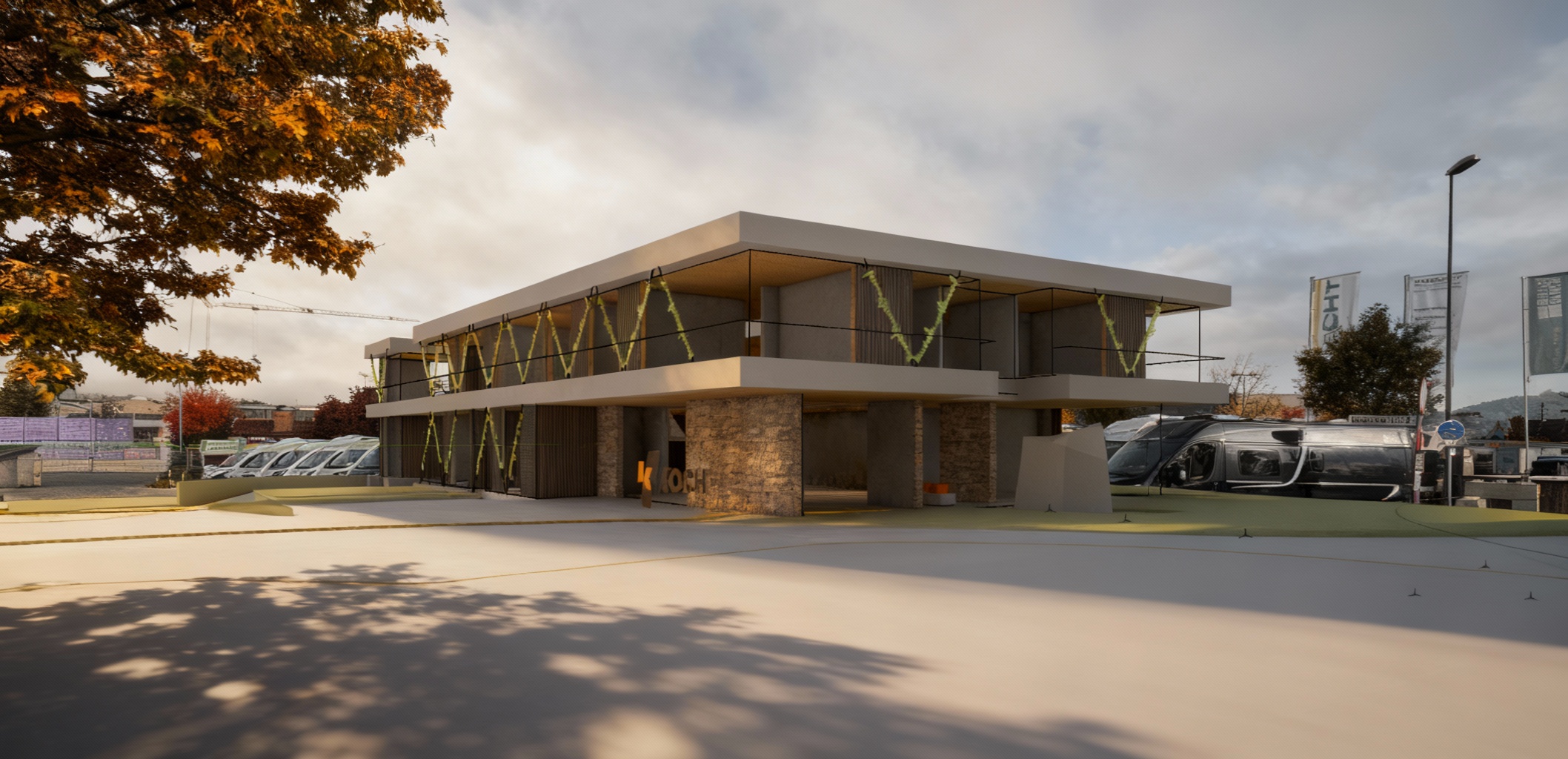 a modern building with a sleek minimalist design featuring a blend of stone and concrete textures the fa ade has vertical green plant accents that add a touch of nature the building is surrounded by a clear bright blue sky and autumn trees with golden and orange leaves the atmosphere should be calm and serene with the warm sunlight casting soft shadows use primarily neutral tones for the building like gray and beige with vibrant green for the plant accents and muted browns and yellows for the autumn foliage