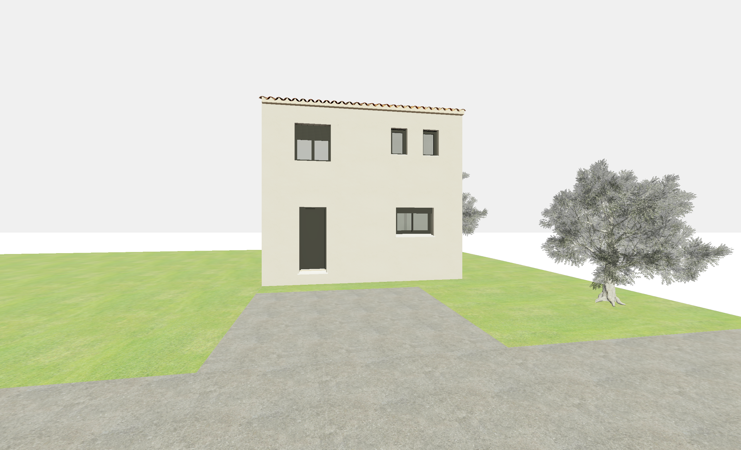 reflects on the windows mediterranean trees and villas in the background add some olive trees near the house a bit of sun on the facade ajoute des lauriers roses sun set in orange and pink sky more trees in the background the facade is more beige more reflects on windows