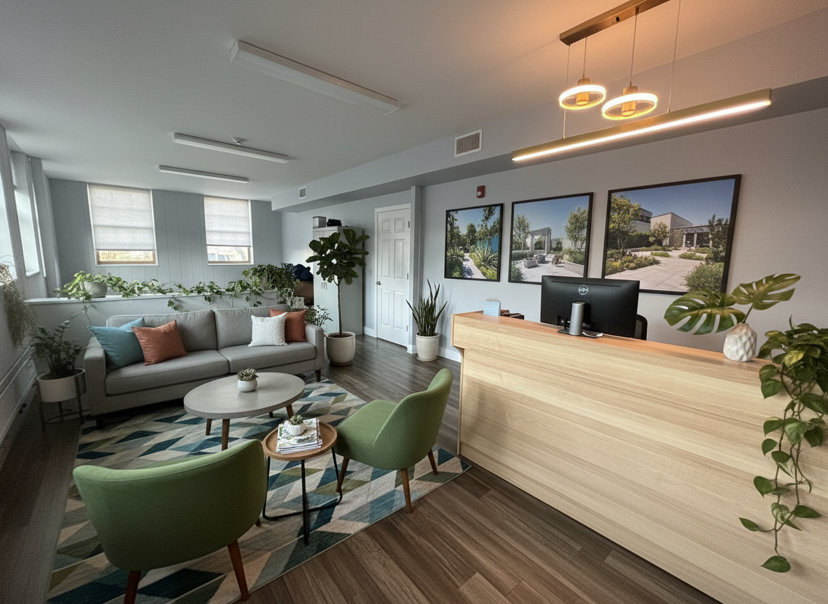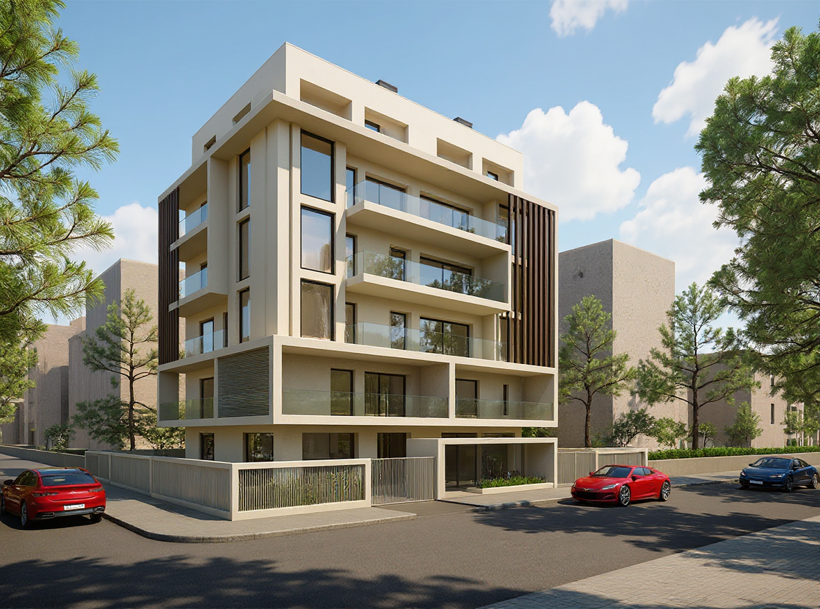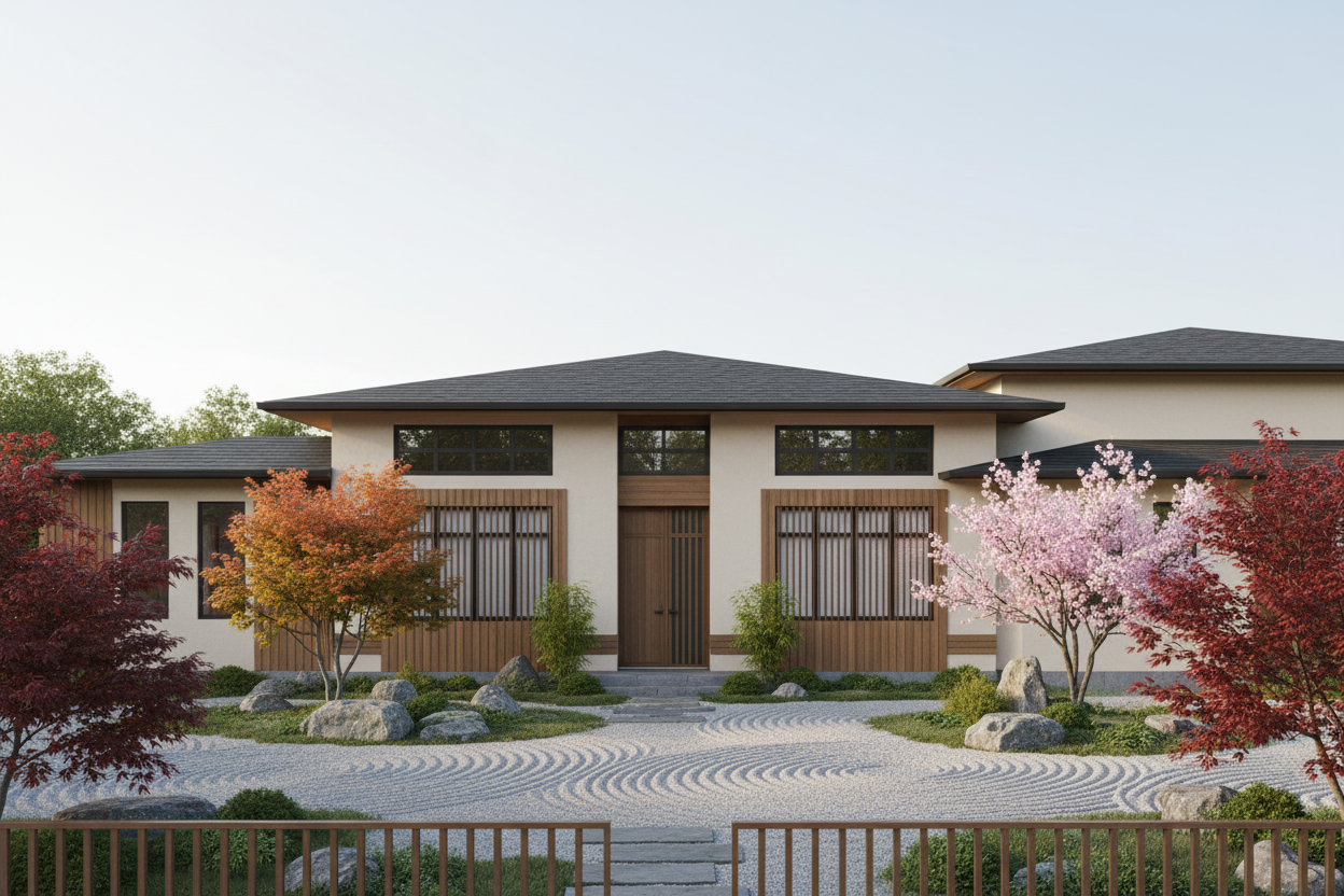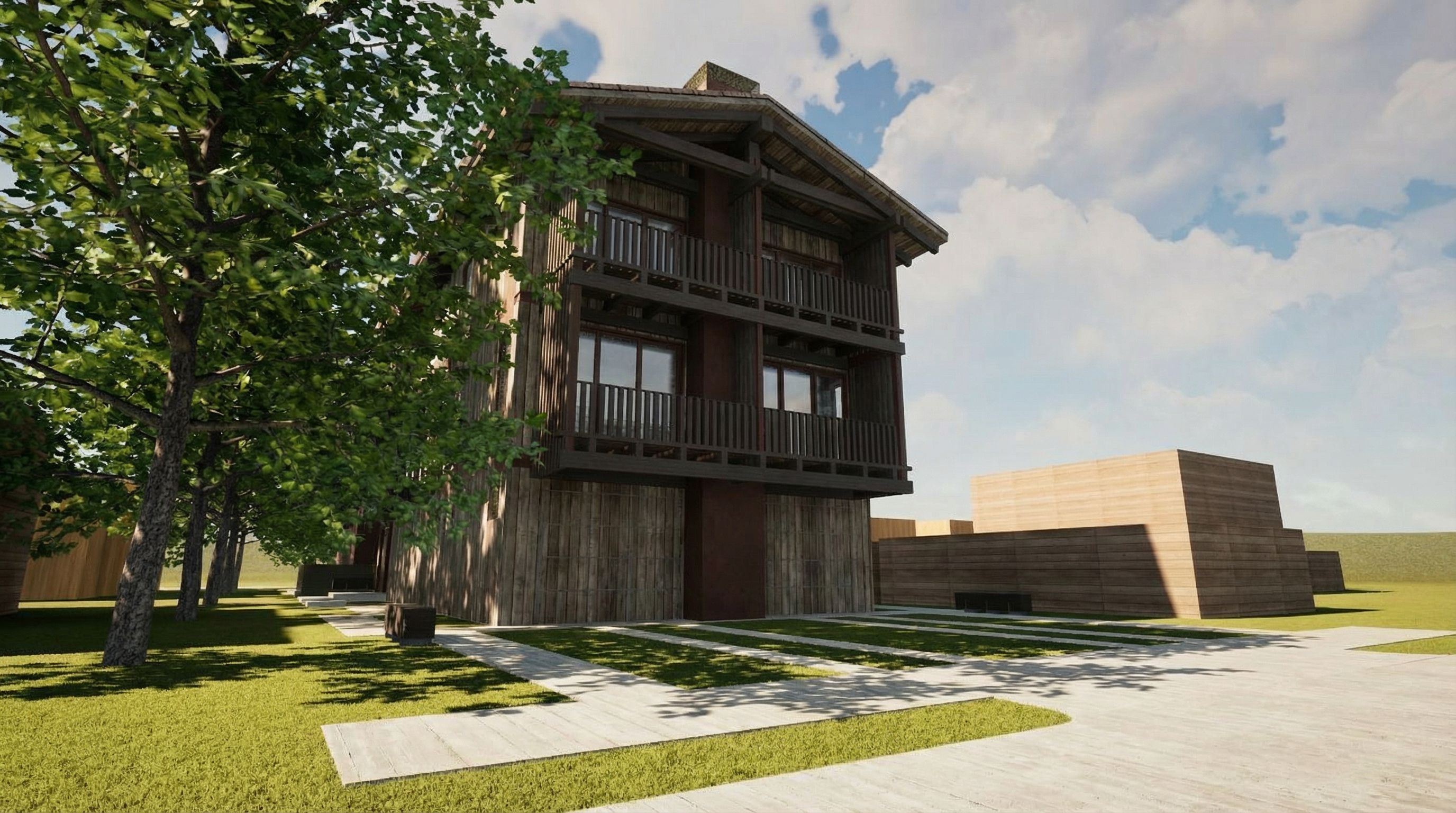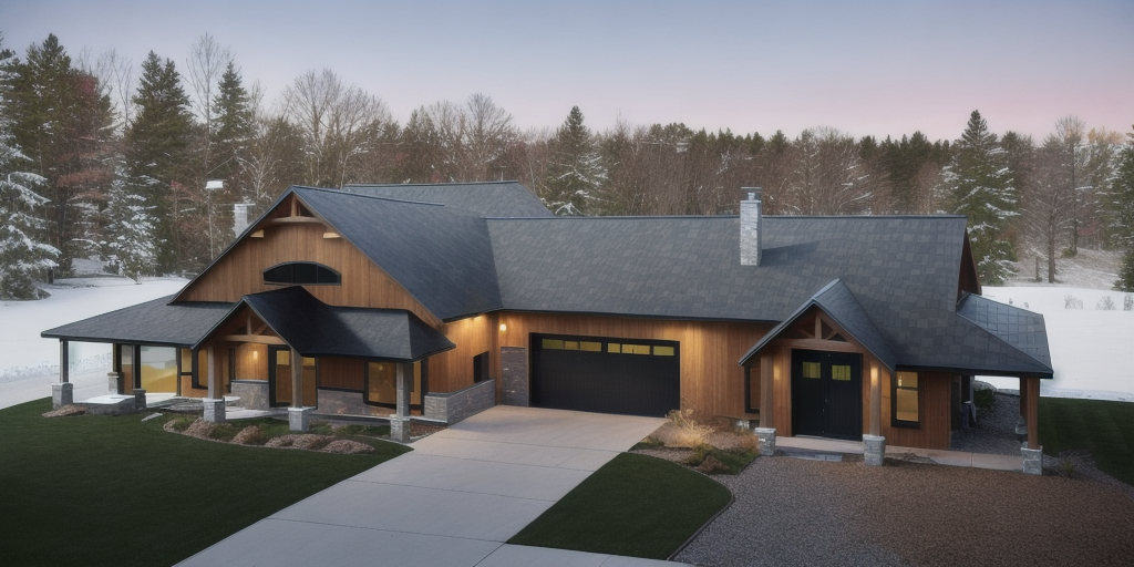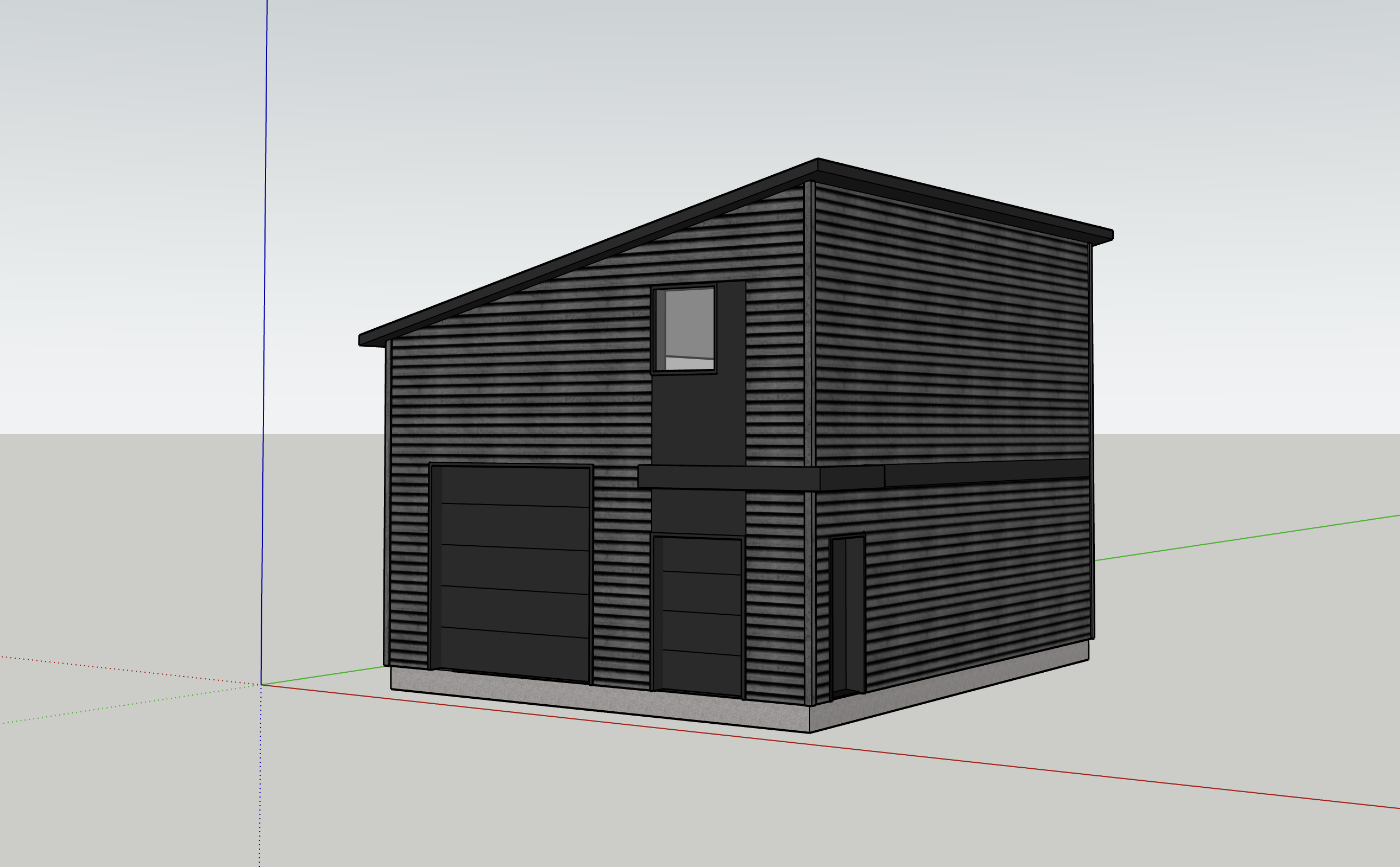 realistic lampscape around a residential garage embedded into the natural terrain slope approximately 12 the rear slope is higher and steeper than the side slopes giving the impression that the garage is set into the hillside the side slopes remain present but slightly less pronounced at the front a compacted gravel yard surrounded by a mature forest of maple birch and spruce with dense canopy natural forest floor and scattered rocks soft natural light realistic rendering slightly elevated viewpoint to clearly show the topography also generate an architectural alternative of the garage keeping the exact same window and door locations as well as the same color palette but offering a different improved architectural expression volumetry materials proportions while remaining harmonious with the natural environment