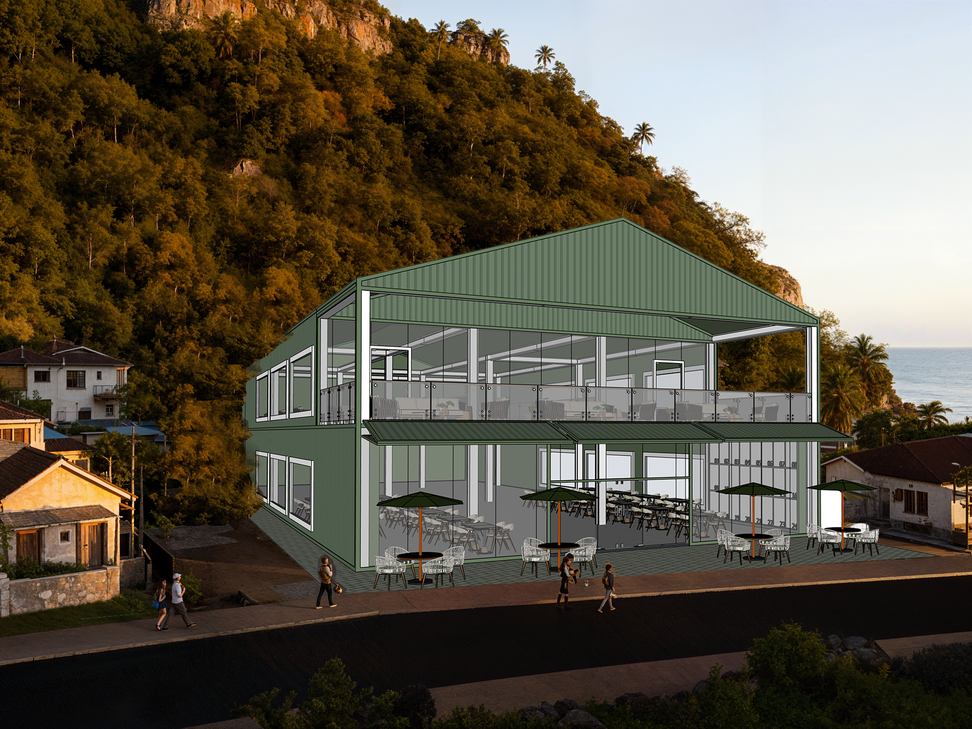 render the raw 3d architectural drawing into a realistic eye level perspective the project is located in a hillside neighborhood of labuan bajo facing the sea in front of the building show a small local road with pedestrian activity blending naturally into the neighborhood setting behind the building depict the back of the hill with dense tropical vegetation and rocky textures suggesting a natural cliff terrain surround the site with neighboring houses to convey a coastal residential atmosphere highlight warm tropical lighting realistic material finishes and the calm sea horizon to evoke the character of labuan bajo s hillside environment