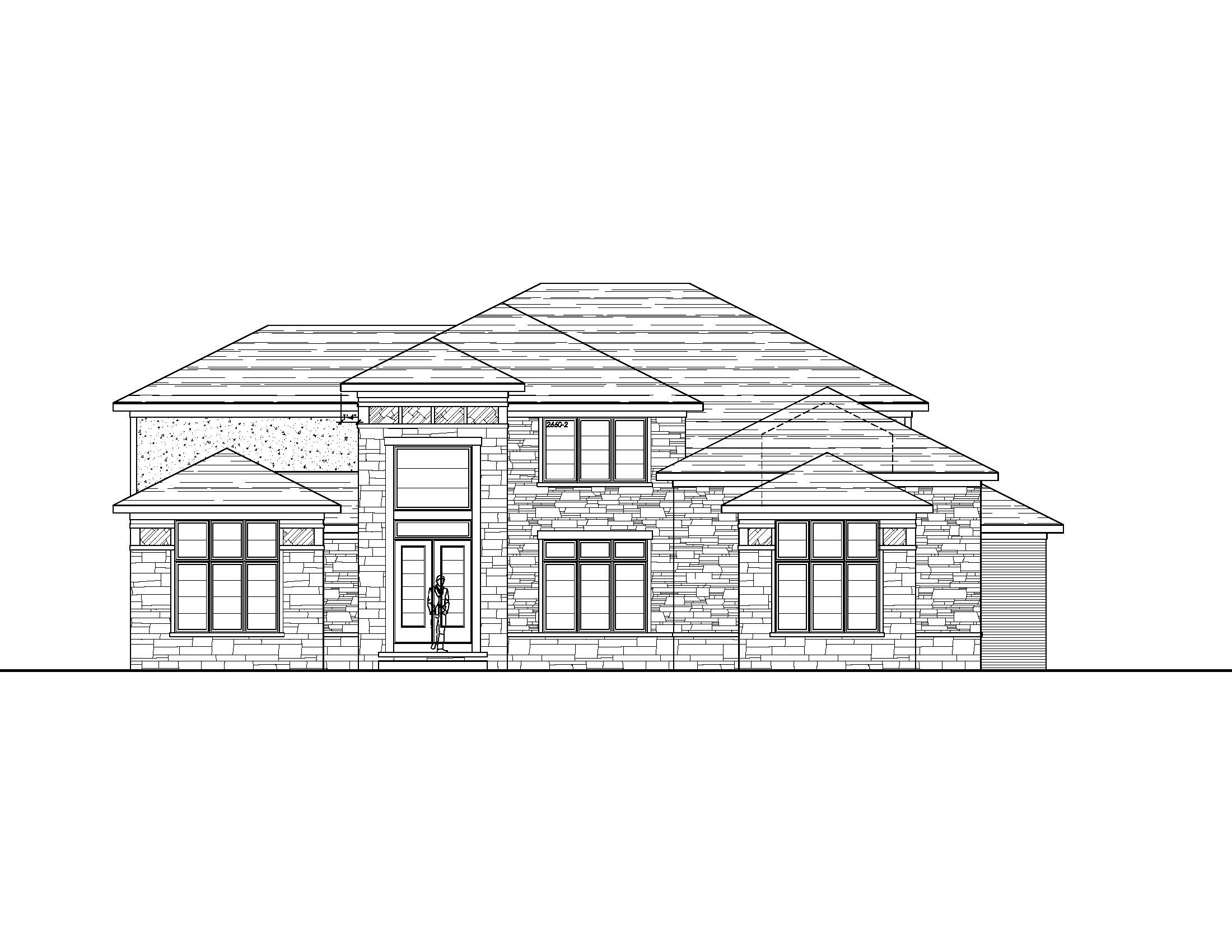 southeast arizona transitional contemporary colonial featuring medium grey earth tone stone w dark grey roof dark grey fascia and frieze and darker grey window frames no driveway shown setting on midwestern residential lot with luscious green grass colorful flowers and stone landscaping