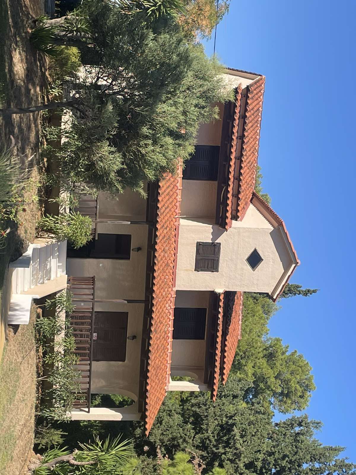 mediterranean revival exterior shot render a serene mediterranean villa surrounded by lush greenery the roof features vibrant terracotta tiles contrasting with the soft beige walls wooden shutters and railings are in rich chocolate brown the foreground showcases a variety of green plants and trees while the backdrop is a clear azure sky capture the peaceful sunlit atmosphere of a warm late afternoon light grey windows architecture