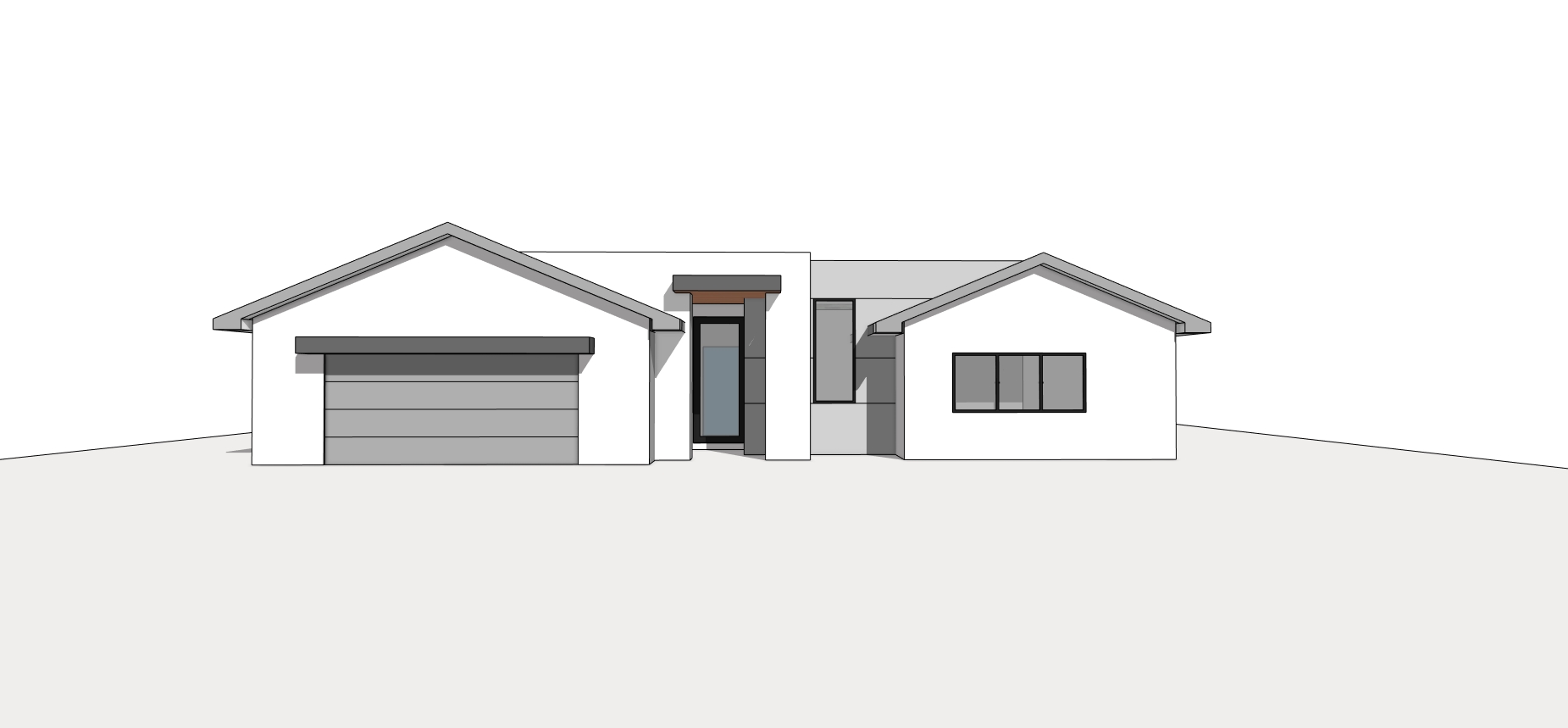 a modern single story house with a sleek minimalist design the exterior is a white and gray with subtle gray accents on the roof edges and window frames the garage door is a smooth shade of charcoal gray large black framed windows add a touch of elegance the atmosphere is serene and contemporary set in a tranquil morning light with a soft blue sky and lush florida green landscaping dotted with vibrant flowers