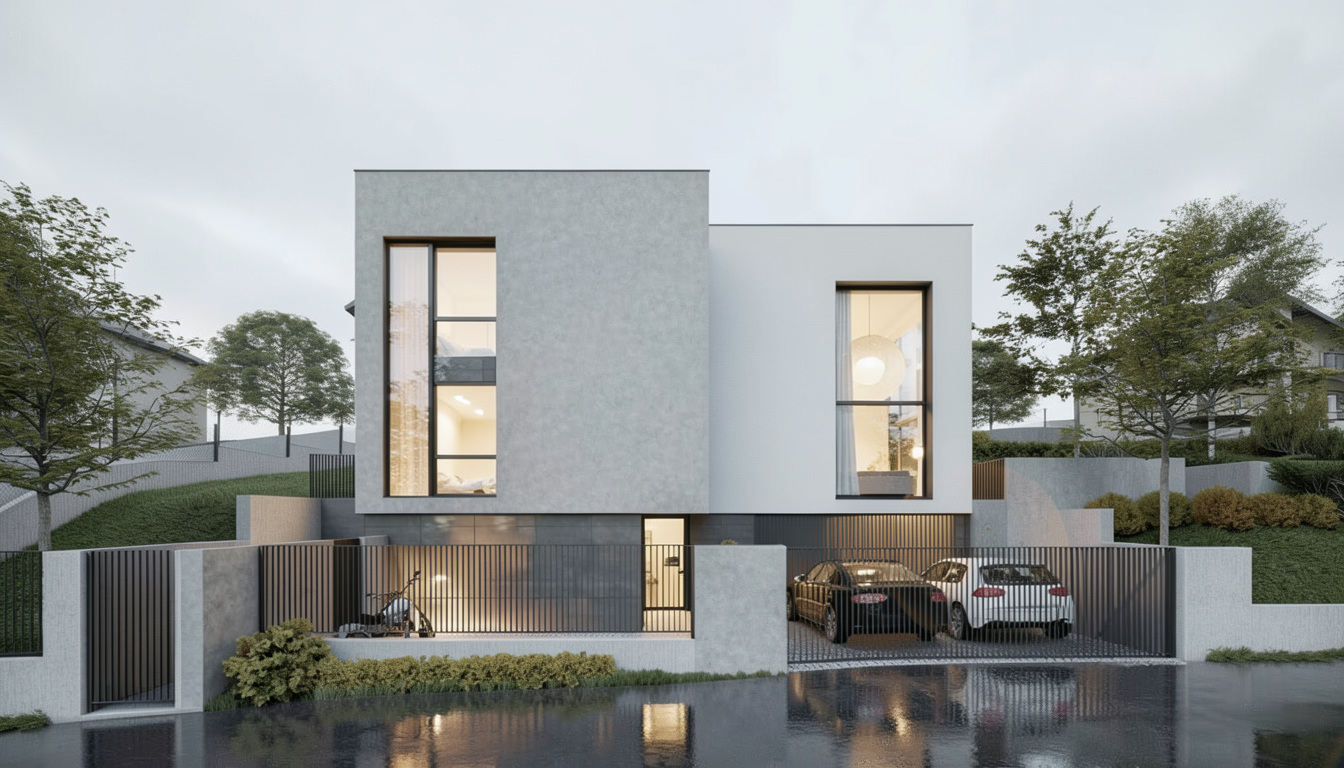 do not change the view keep model geometry the same windows doors roof walls pavement driveway fences facade decor sidewalk hyper realistic 8k cinematic lighting serene atmosphere photorealistic textures realistic reflections reference the current material style just enhance them only enhance the current materials and make the landscape nicer vegetation detailed textures in the wood siding and glass reflections and a vibrant clear sky with light atmospheric depth render in hyper realistic architectural visualization quality 8k resolution roof minimalist anthracite concrete tile facade a mix of smooth white mineral plaster horizontal walnut wood slats windows antracit aluminium minimal fence anthracite colored premium metal mesh landscape professional minimalist garden design green clean cut grass 2 young maple tree prunus laurocerasus whether nice clear early summer in middle europe outside the fence natural hungarian native forest do not add extra fence original fence is a 2 m high prunus laurocerasus fence