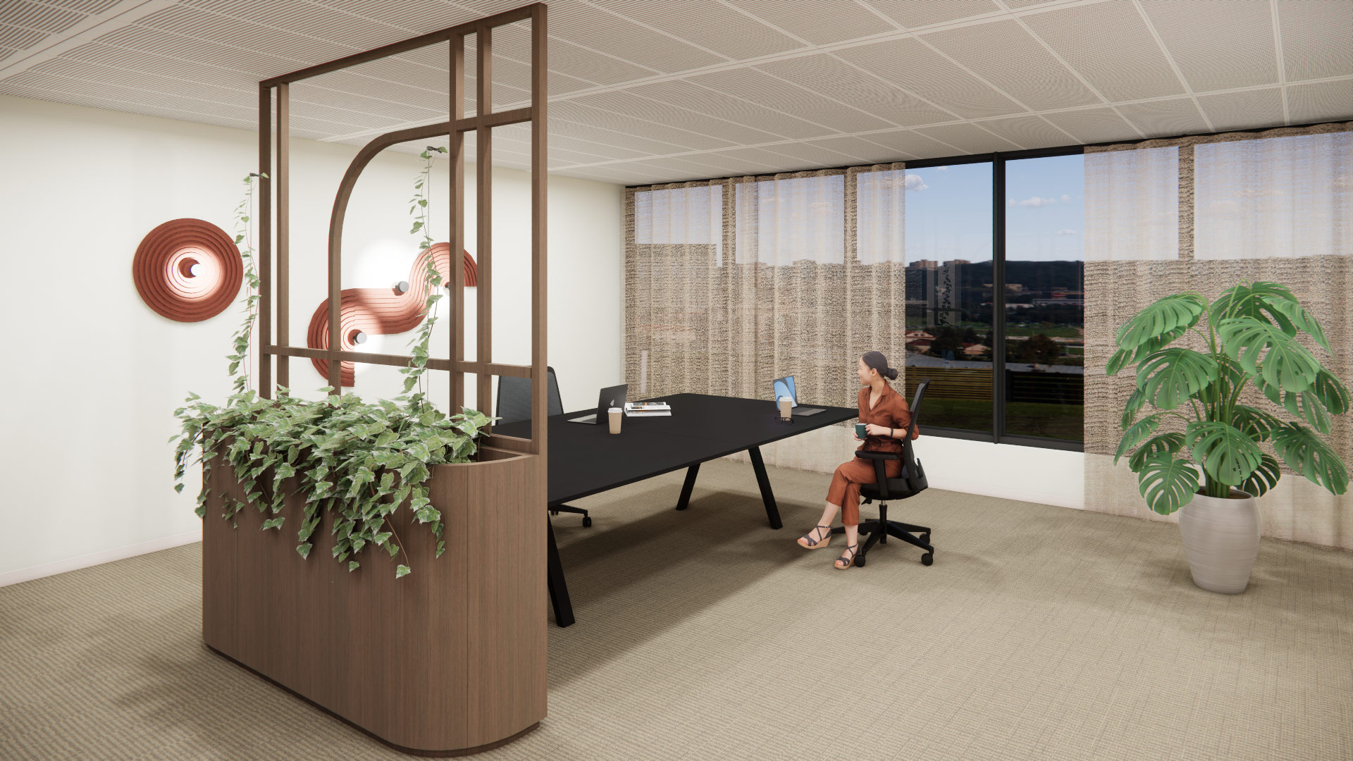 modern office interior featuring a central wooden partition with cascading green vines adding a touch of nature to the space the background showcases a panoramic window town view with a serene sky the lighting is soft and natural casting gentle shadows the ceiling is detailed with a textured white panel design complementing the clean minimalist warm beige carpet enhancing a calming elegant atmosphere with linen beige curtains along the large windows