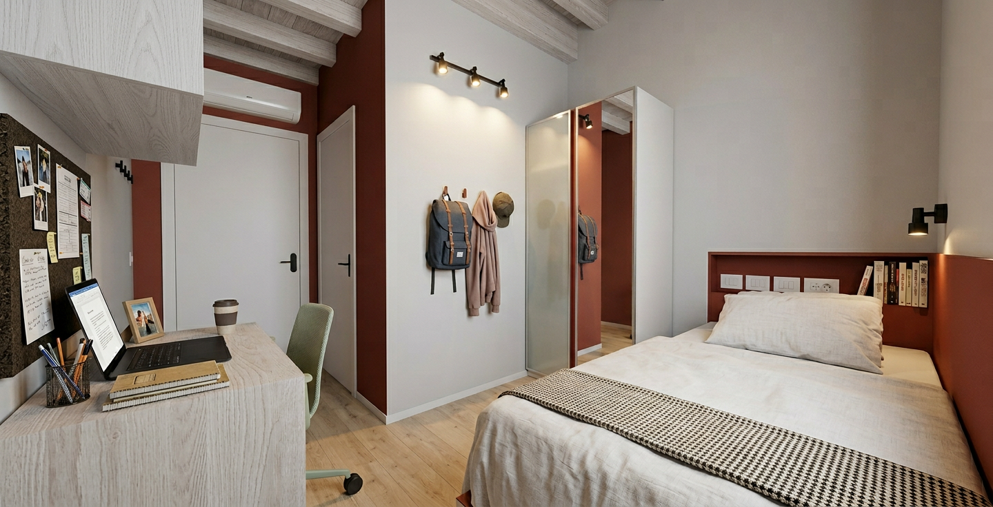 e una palestra a terra abbiamo un pavimento in parquet in rovere chiaro continuo a liscio la porta di ingresso in vetro cannettato infondo ci sono solo due grandi specchi ad arco a filo lucido e non ci sono altri specchi solo la parete degli spogliatoio nera i pilastri in ferro sono neri non ci sono strip led come illuminazione come illuminazione abbiamo dei binari neri con faretti neri a luce calda fai entrare un p di luce naturale dalle finestre metti qualche oggetto come zaini palestra attrezzi e borracce
