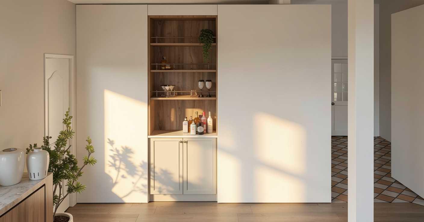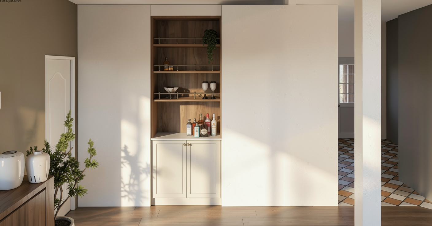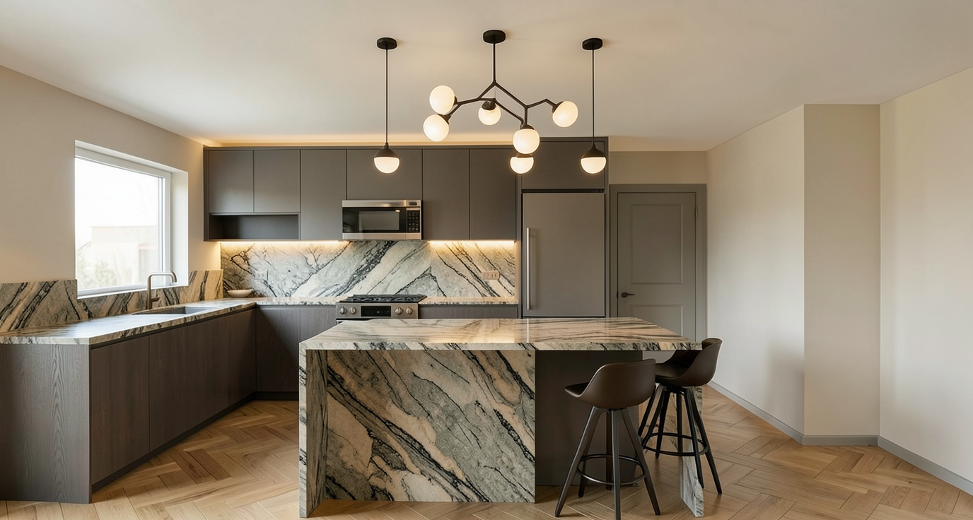 overall aesthetic warm contemporary minimalism everything is texture and proportion cabinetry flat front handle less doors throughout dark brown shinoki oak stone countertop dramatic bookmatched or large format slab grey cream marble with heavy movement island has a waterfall edge with thick profile same stone used for backsplash on the stove wall sink side does not have stone backsplash flooring wide plank herringbone hardwood warm honey light oak tone matte finish medium width planks fixtures square angular matte bronze or gunmetal faucet minimal spout 90 geometry lighting sculptural pendant branching arm in dark bronze black with opal globe shades in varying sizes artistic not symmetrical subtle under cabinet or recessed puck lighting on perimeter wall warm glow on backsplash color palette for rendering cabinetry warm greige ncs s 5010 y50r or benjamin moore rockport gray range floor warm light oak metal dark bronze antique brass matte