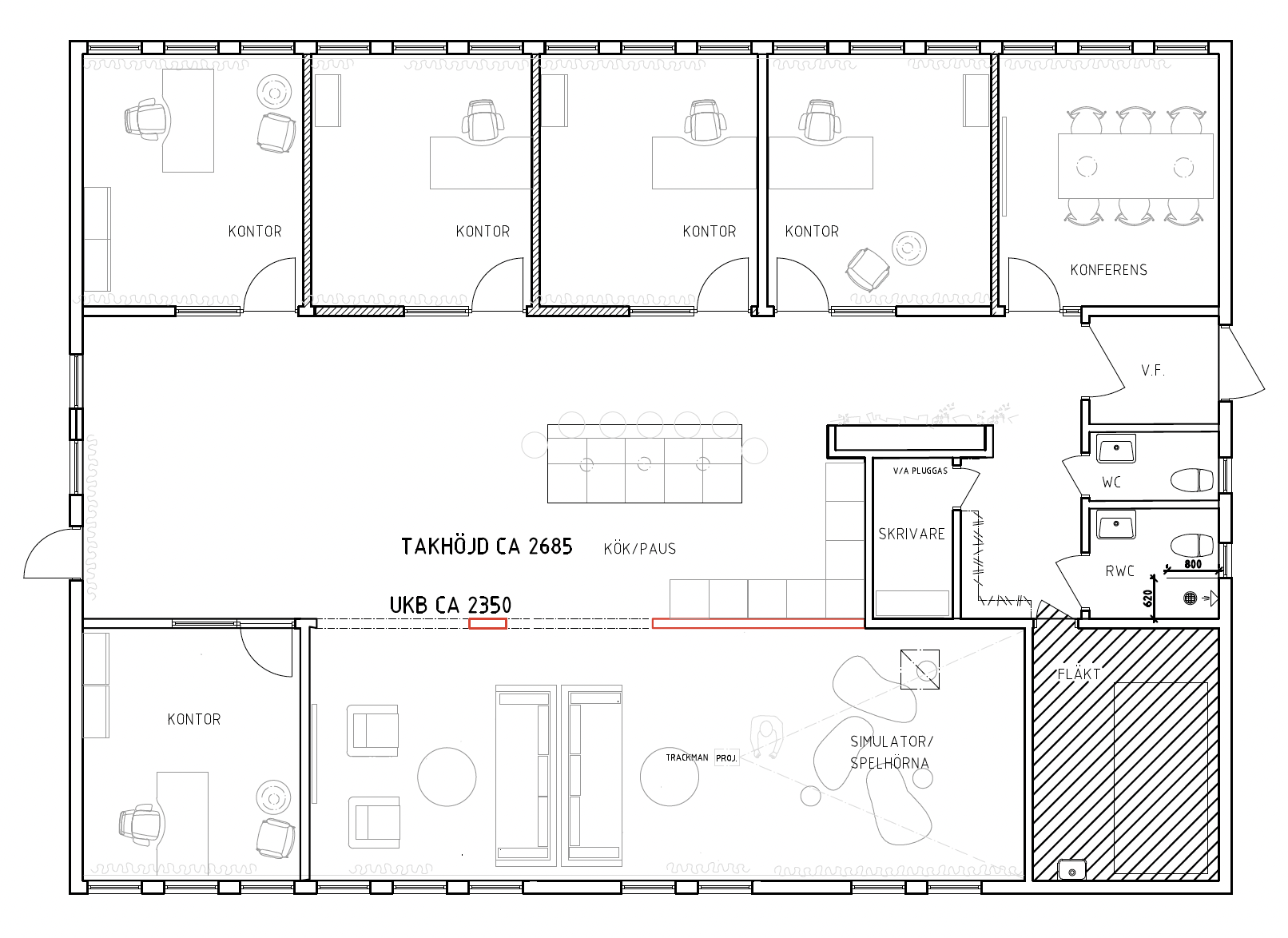 convert this floor plan into a realistic isometric 3d view of a full house show the space from an elevated angle with furniture walls and details visible create a high quality 3d rendering based on a floor plan transforming it into a photorealistic office environment the design should feel modern sophisticated and cohesive throughout the room located in the bottom left corner of the floor plan should be designed as a golf simulator room with appropriate equipment ambient lighting and a slightly more immersive leisure focused atmosphere compared to the rest of the space all other areas of the building should feature warm beige textile carpet flooring creating a soft and inviting foundation the walls throughout the office should use dark muted tones in gray green and gray blue shades contributing to a calm elegant and slightly moody atmosphere the wc should have a distinct premium look with green marble surfaces combined with black details fixtures should be clean white porcelain creating a strong contrast and a refined modern finish lighting should be realistic and soft enhancing materials and textures with attention to natural light where applicable emphasize photorealism accurate materials and a balanced high end office aesthetic use the same furniture as shows on the plan do not change the orientation of the floorplan