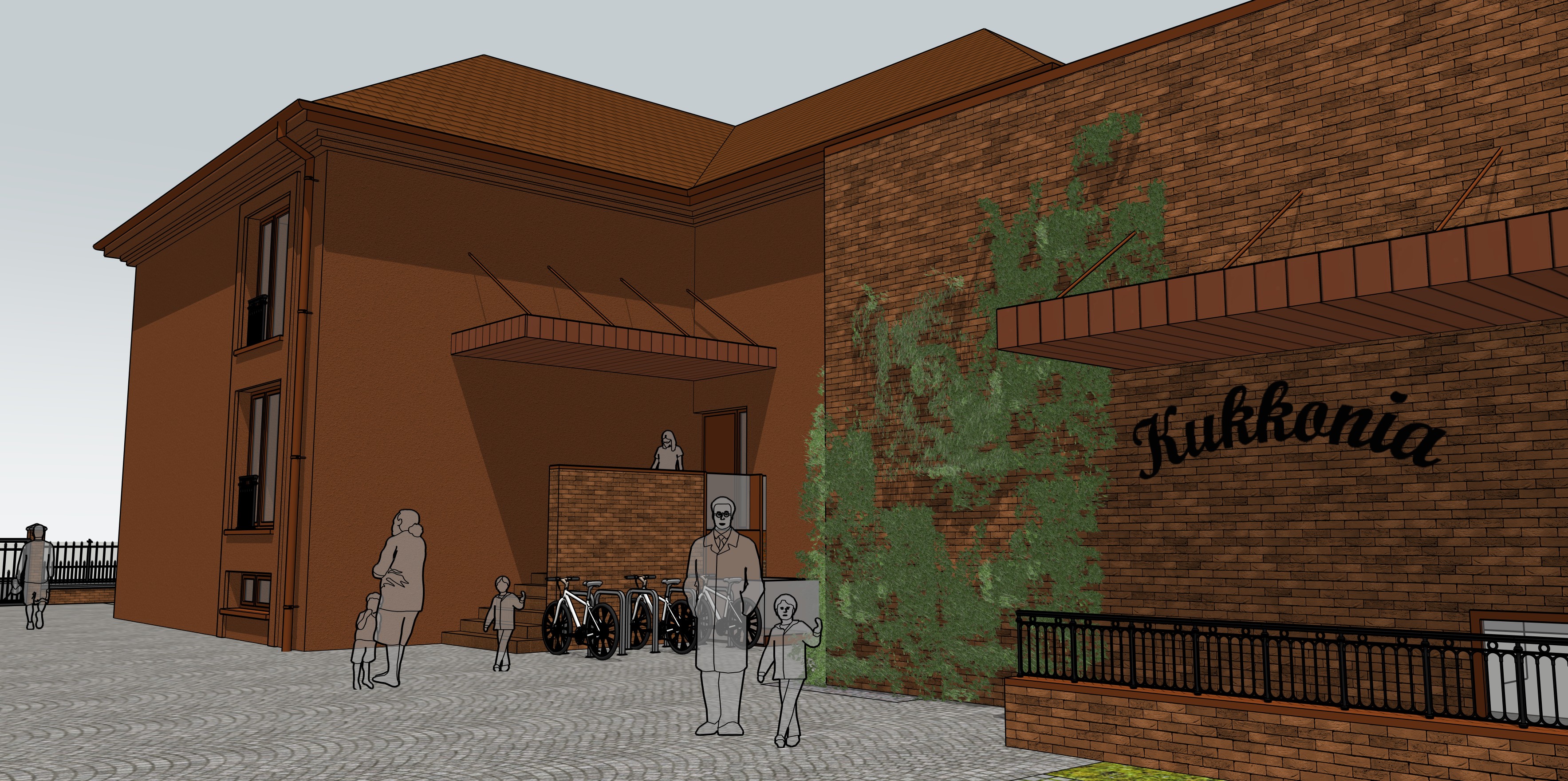 educational building render a photorealistic 3d perspective of this house in a truckee ca reference the current material style just enhance them bronze standing seam ceramic tile roof plastered walls keep model geometry the same windows doors roof walls make a lush vegetation that looks native to truckee ca do not change the view only enhance the current materials and make the landscape nicer vegetation detailed textures in the wood siding and glass reflections and a vibrant clear sky with light atmospheric depth render in hyper realistic architectural visualization resolution surrounded by a lot of trees kids an parents inside and on the streets climbing plant part of small town street on left side of picture