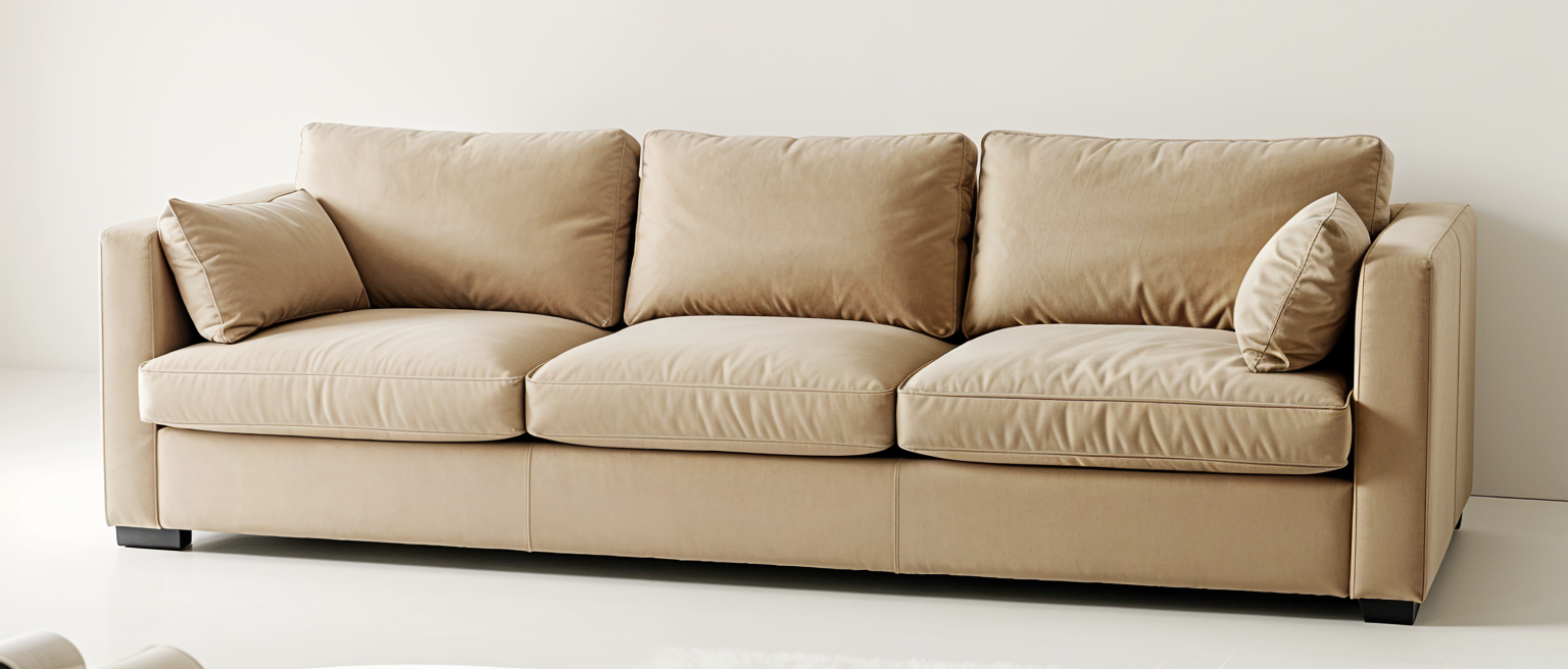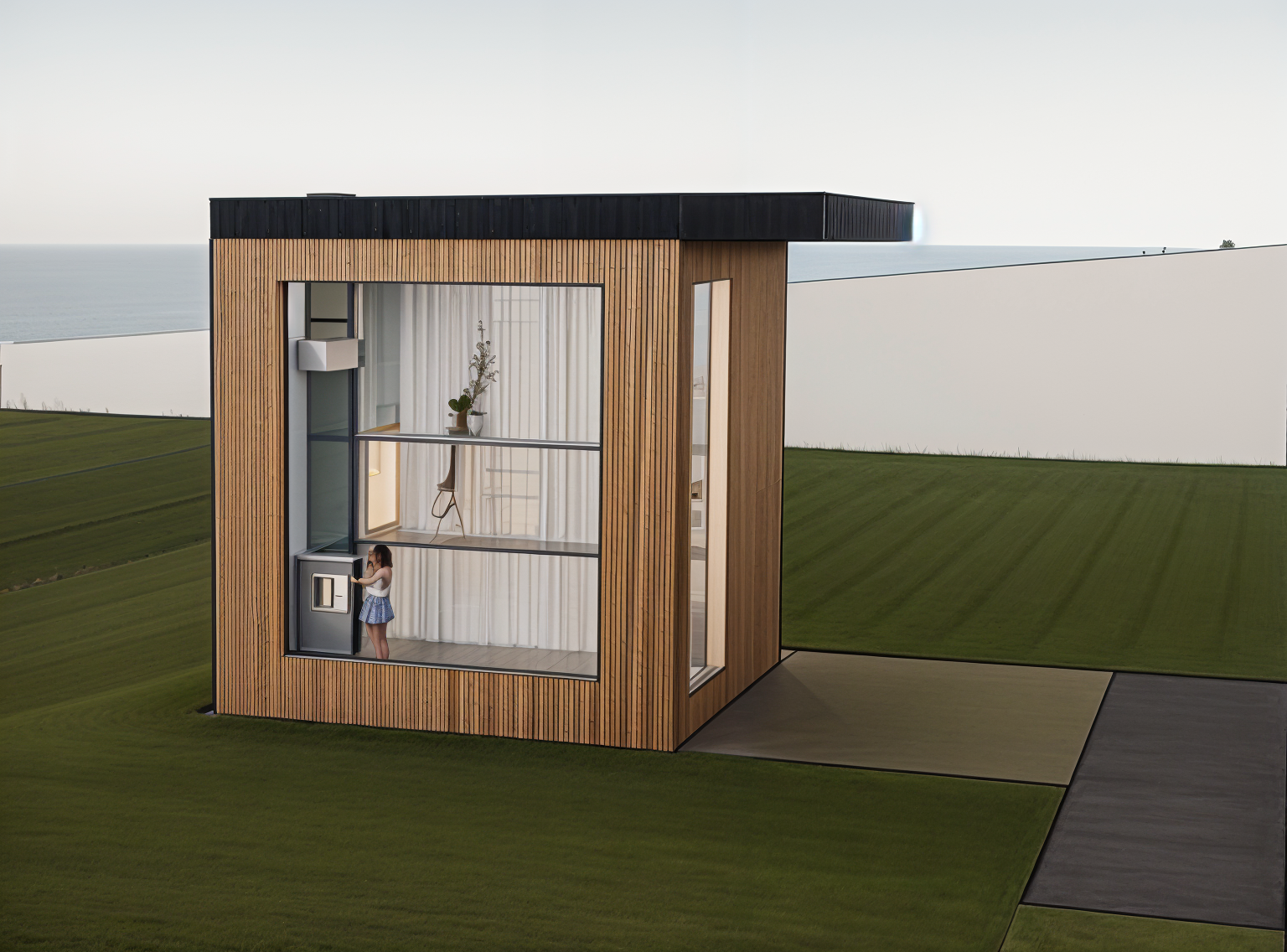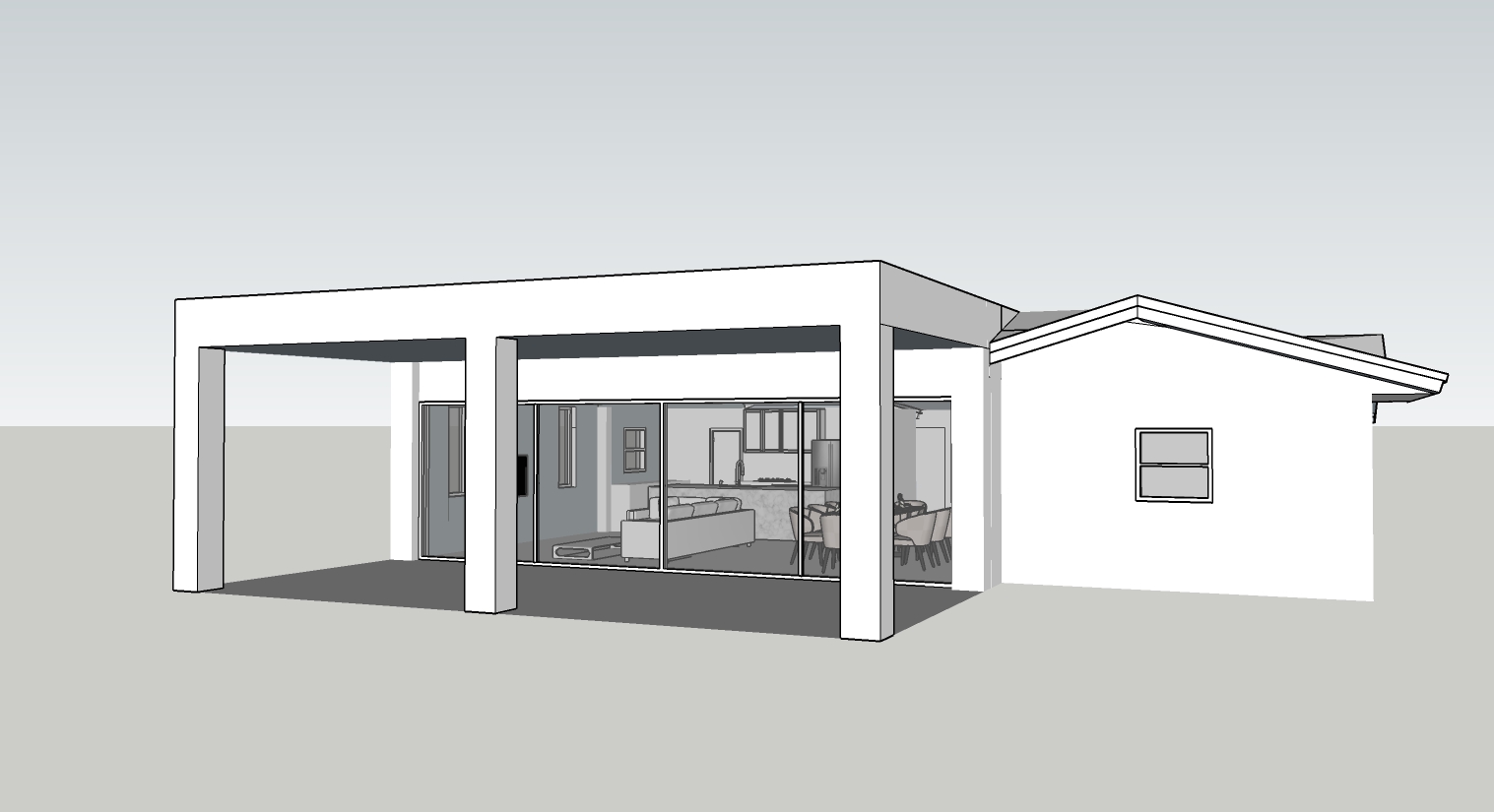 generate a realistic rendering of the exact same architectural scene shown in the uploaded image do not change any part of the structure layout furniture or materials the layout is as follows the living room is on the left the kitchen is directly behind the living room and the dining area is on the right there is a large sliding glass door across the entire front facade providing a full view into the living kitchen and dining areas surround the structure with a tropical florida landscape including lush green grass various palm trees and native tropical plants such as hibiscus bird of paradise and ferns the sky should be a bright sunny florida day with light clouds ensure that all architectural elements remain exactly as shown no changes to the house design window placements columns or furniture arrangement white painted walls